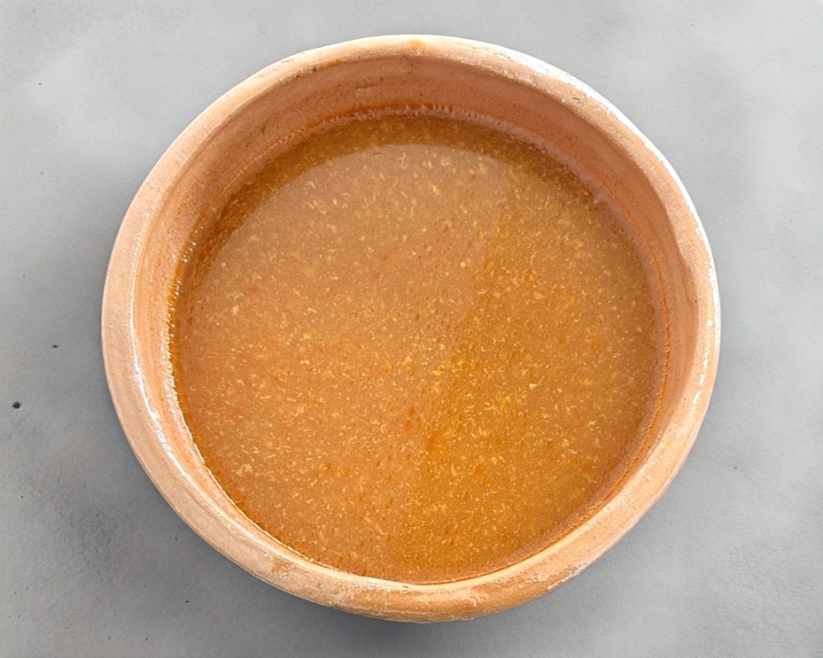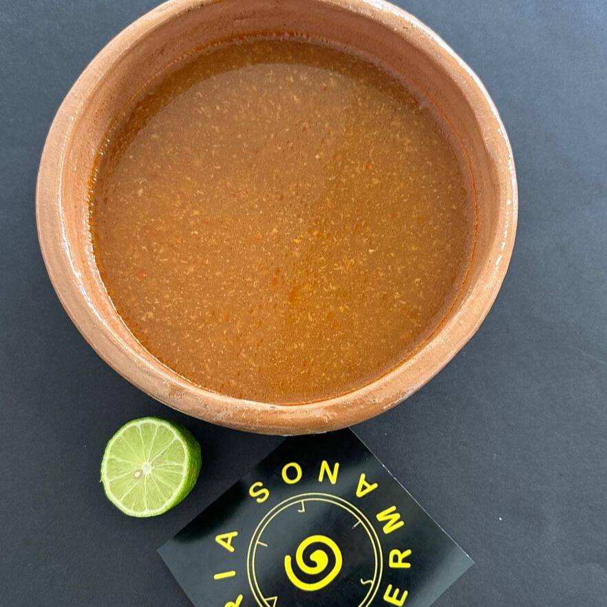 Porción de 170 g de carne de birria de res con consomé, servido un recipiente de un litro y acompañado de tortillas