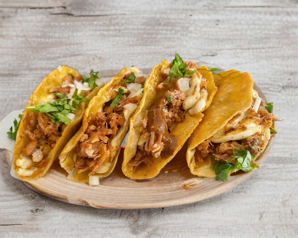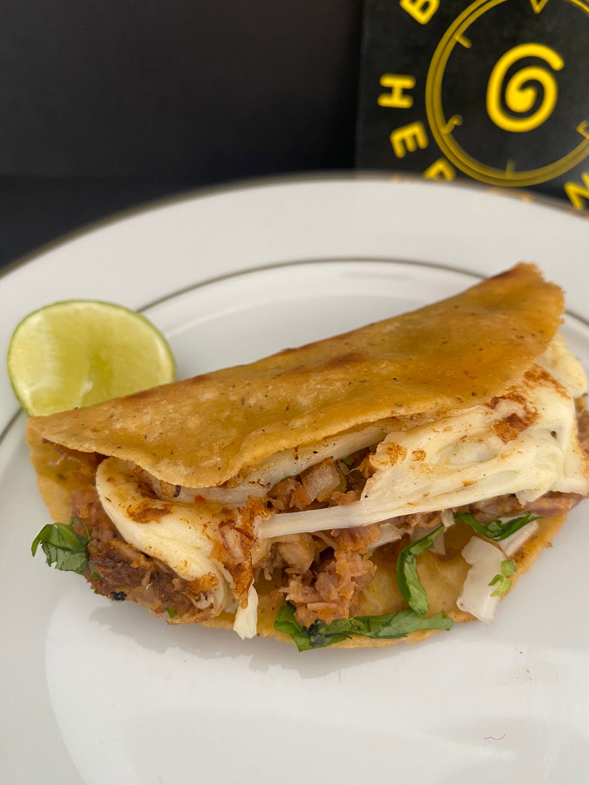 Una tortilla dorada del número 14 con porción de 33g de carne maciza de birria de res y 20g de queso derretido
