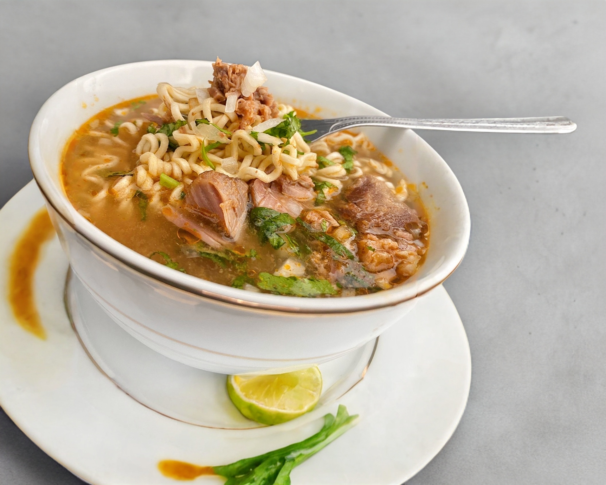 85g de pasta ramen 100g de carne de birria de res y 500ml de consomé servido en un recipiente de un litro