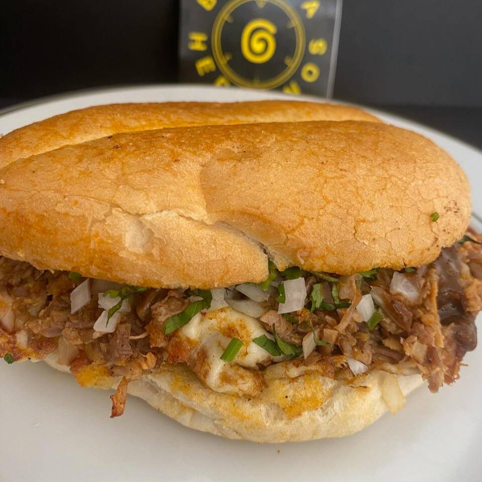 Una telera con porción de 100g de carne de birria de res y 60 g de queso derretido