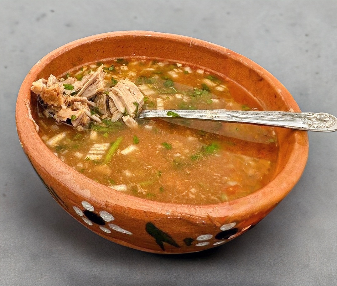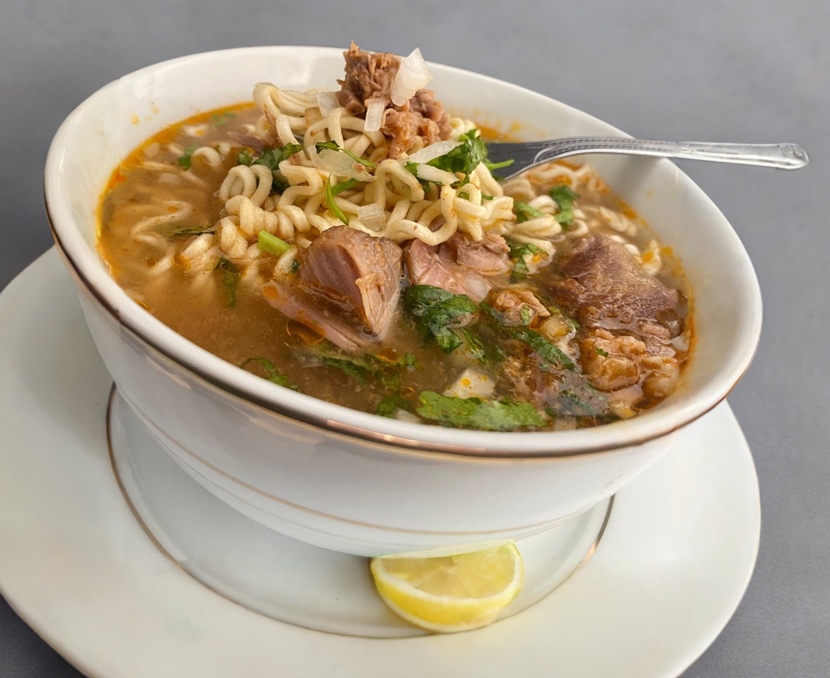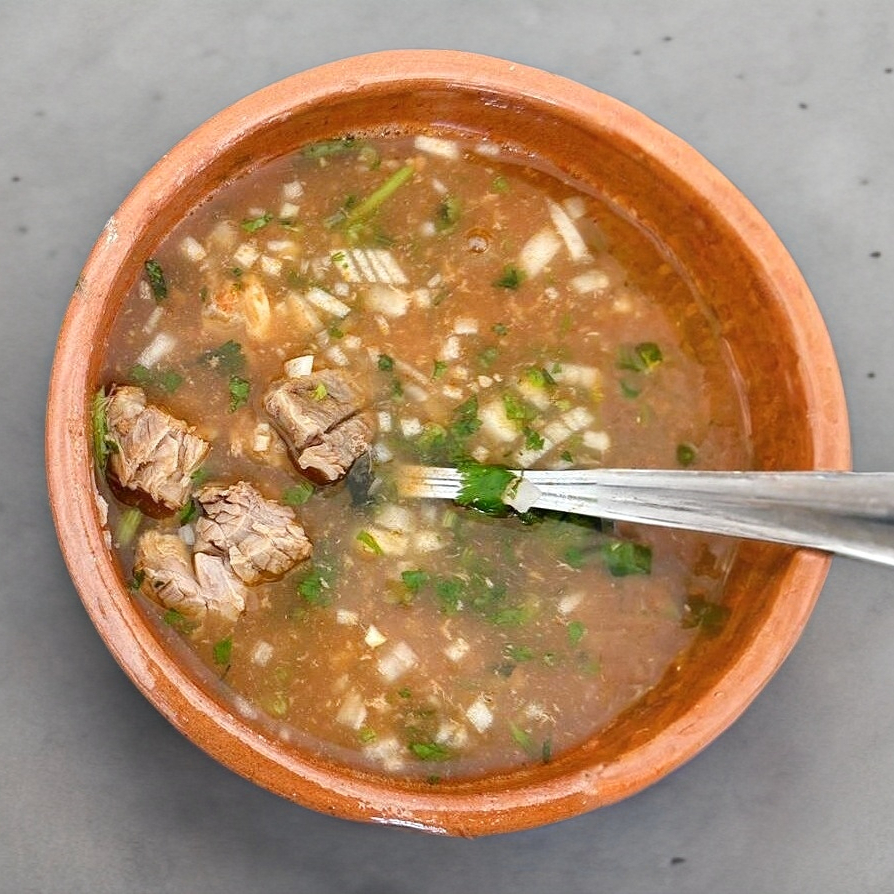 85 g De pasta ramen, 100 g de carne de birria de res y 500 ml de consomé servido en un recipiente de 1 L.