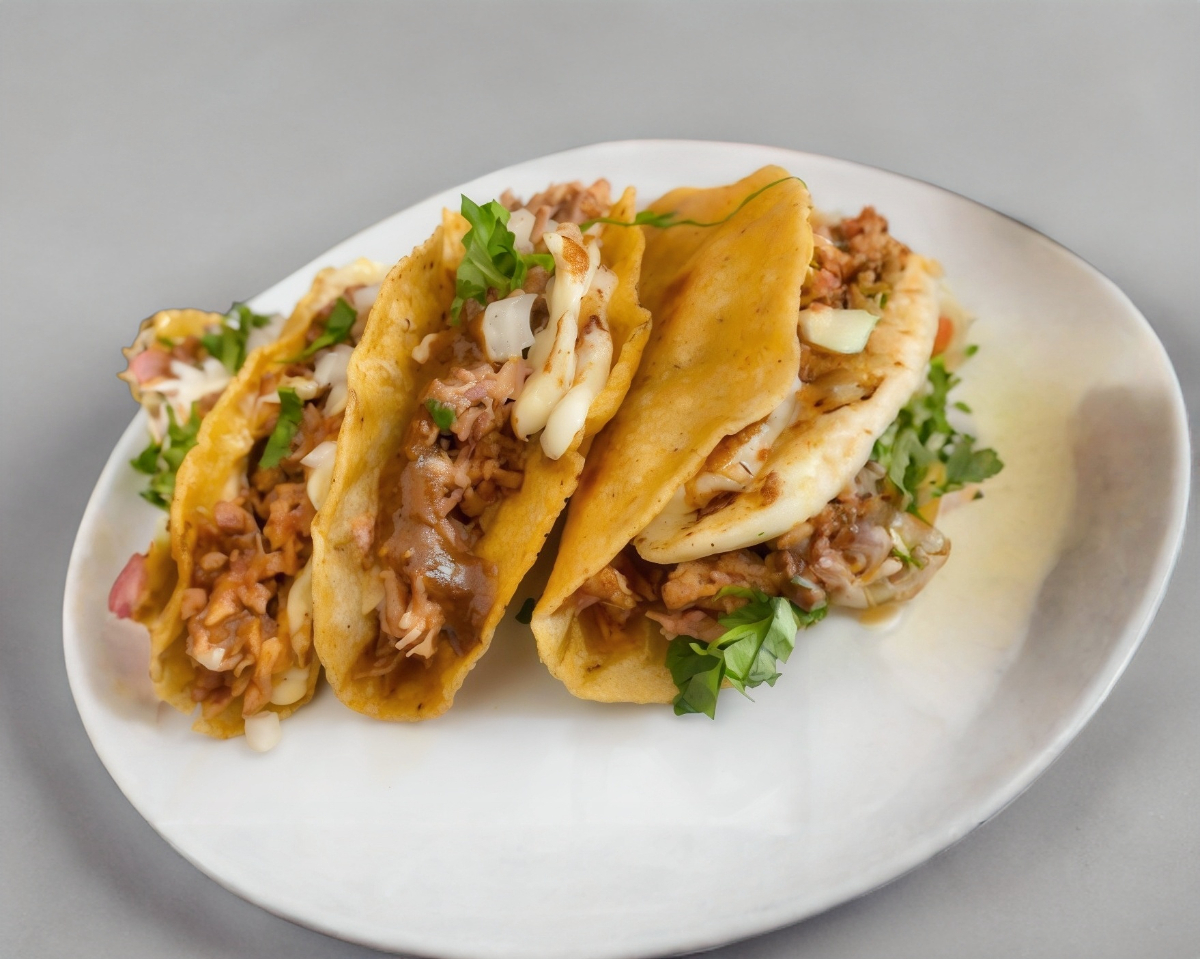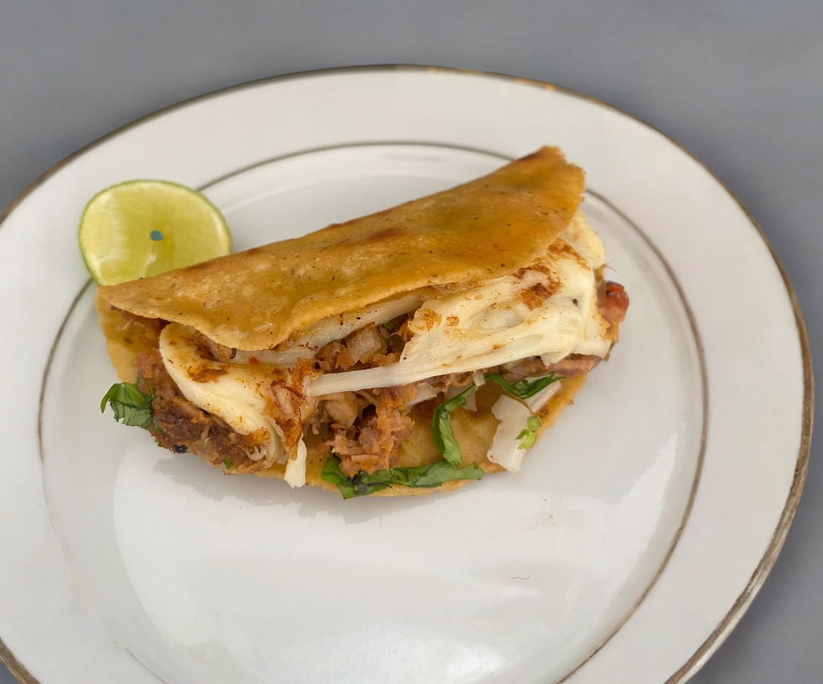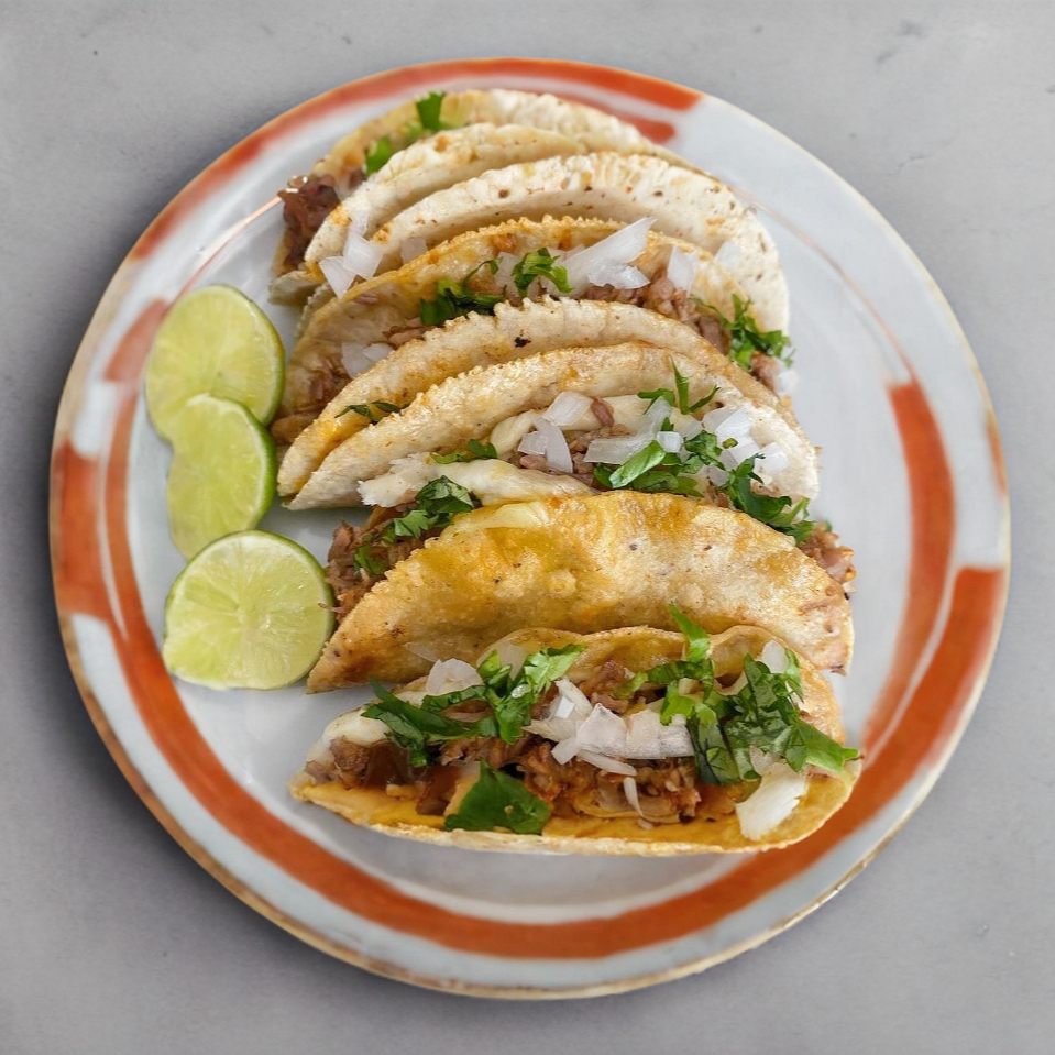 Una tortilla dorada del n° 14 con porción de 33 g de carne de birria de res y 20 g de queso derretido, salsa aparte, verdura y limón aparte.