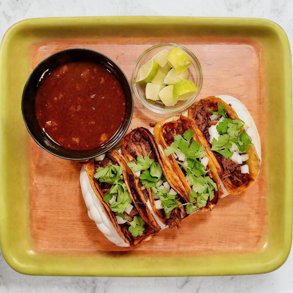 Tocos con boble tortillas de maíz, rellena de birria, acompañada de cebolla, cilantro, limón y salsa.