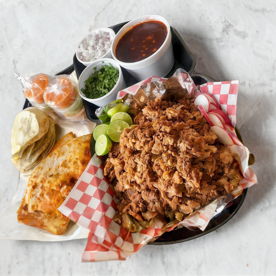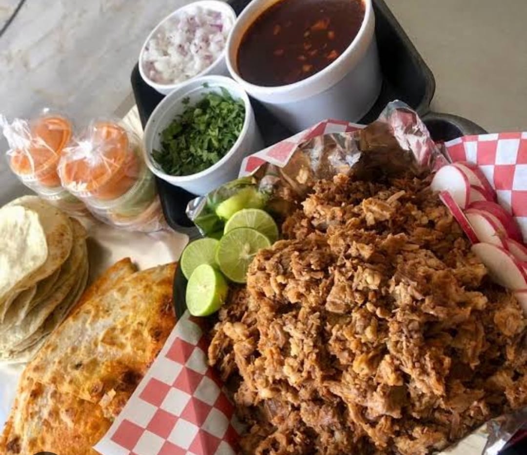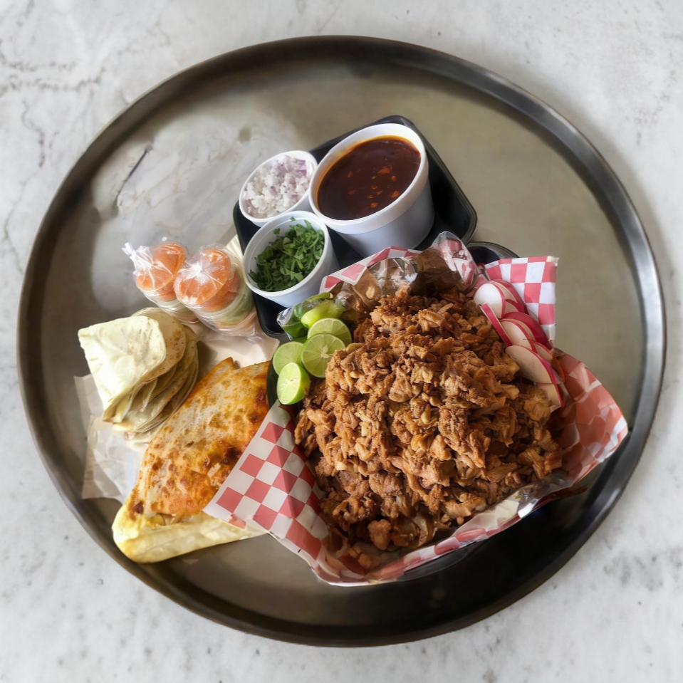 1 kilogramo de birria, 1 litro de consomé, tortillas, cilantro, cebolla, limon y 2 salsas.