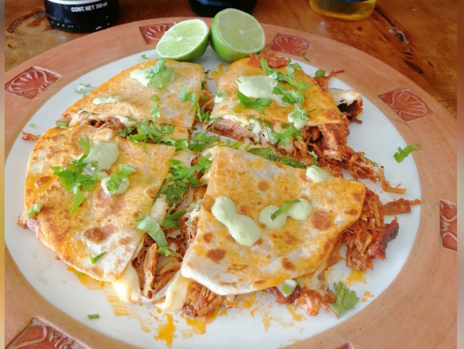2 tortillas de harina, rellena de birria de res con queso Oaxaca, acompañada de cebolla, cilantro, limón y salsa.