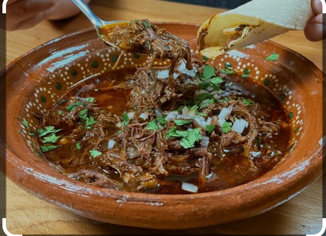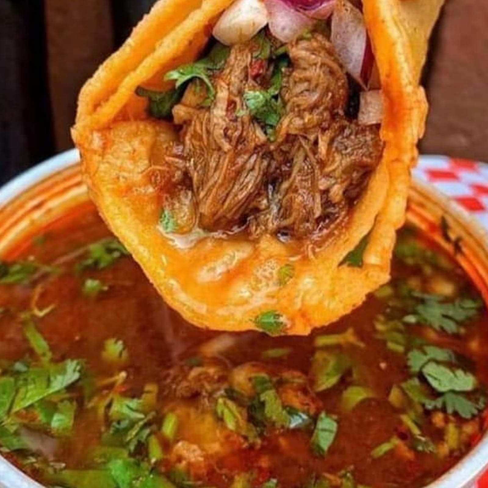 Taco con doble tortillas de maíz, dorada con el mismo adobo de la birria, rellena de birria, acompañada de cebolla, cilantro, limón y salsa.
