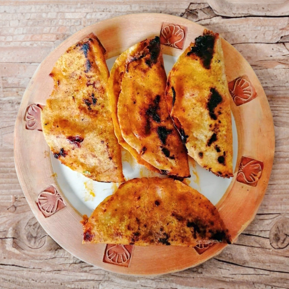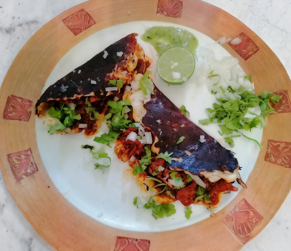 Tacos con doble tortillas de maíz, dorado con el mismo adobo de la birria, relleno de birria con queso Oaxaca, acompañado de cebolla, cilantro, limón y salsa.