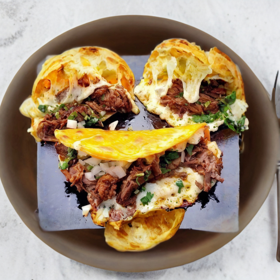 Queso Oaxaca fundido a la plancha rellena de birria de res acompañada de una tortilla de harina, cebolla, cilantro, limón y salsa.