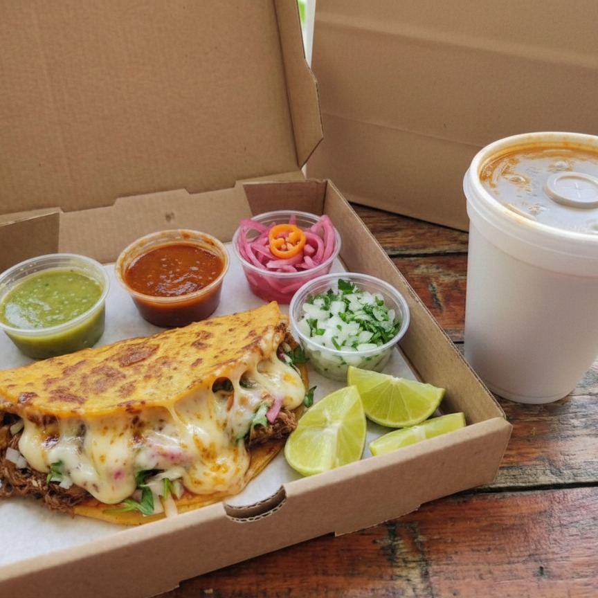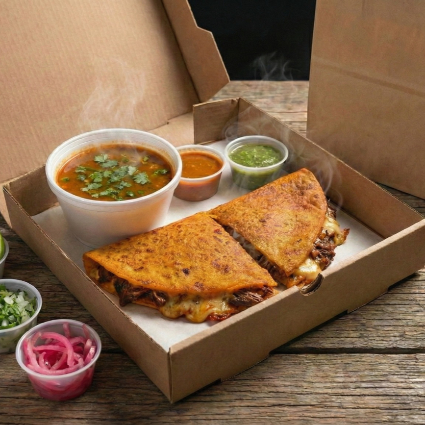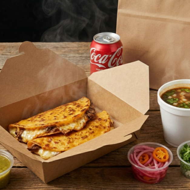 El kit de emergencia oficial. 1 Birriamen caldoso para el alma + 1 Quesabirria crujiente + Refresco frío. Si esto no te cura, nada lo hará.
