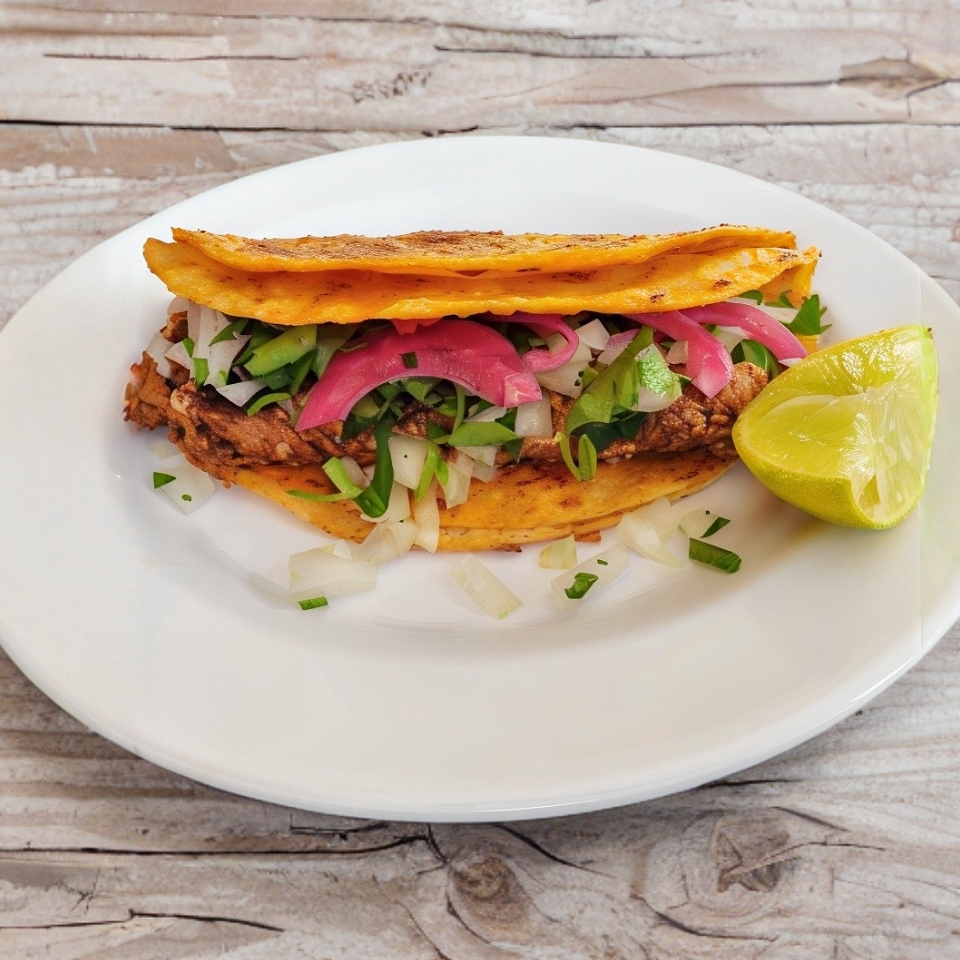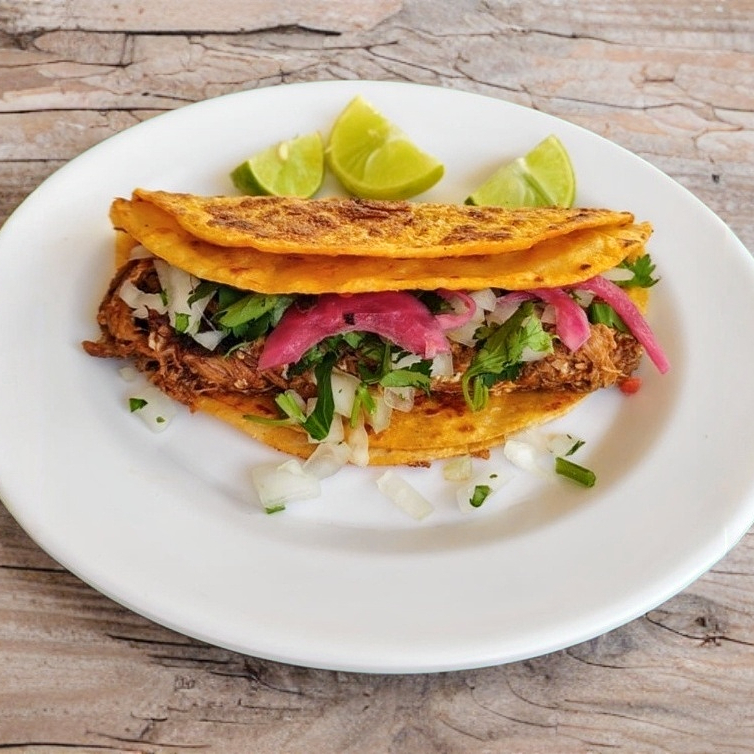 Taco suave de doble tortilla relleno de deliciosa birria de chivo.