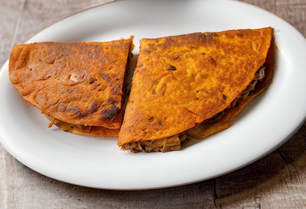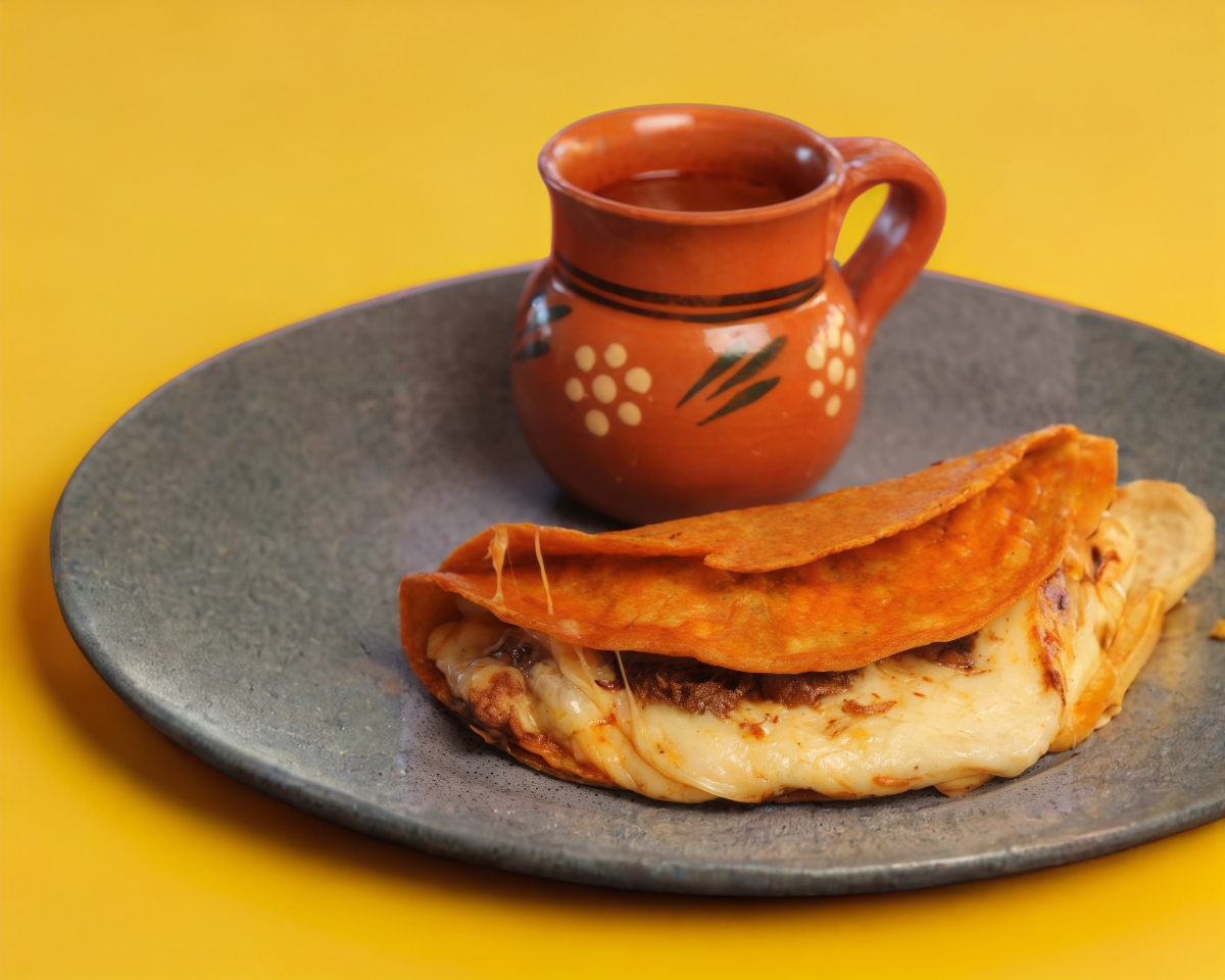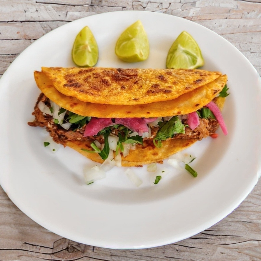 Quesabirria de res en tortilla de maíz.