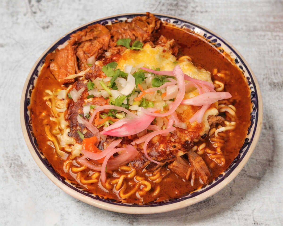 Una deliciosa birria de res que además complementamos con pasta ramen y queso fundido.