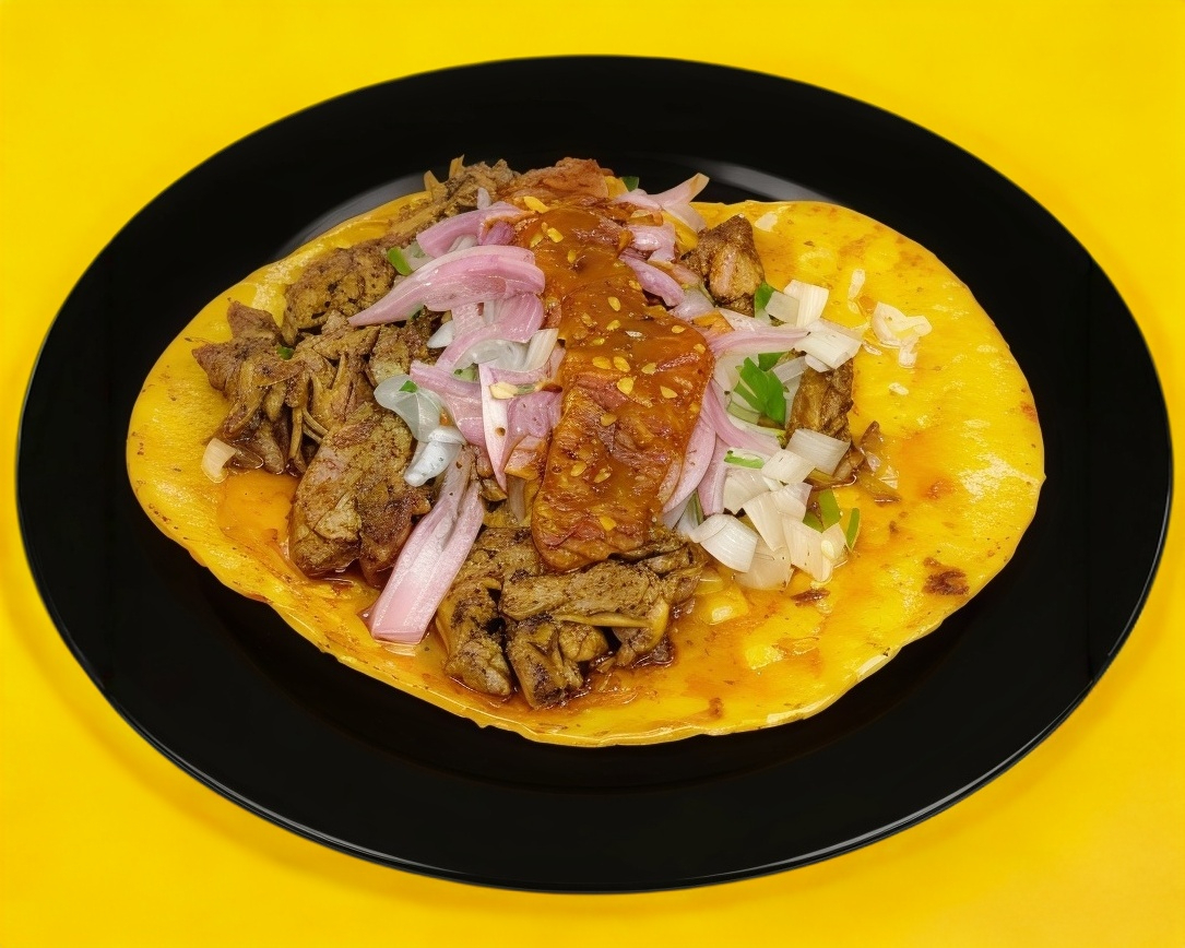 Elaborada con birria de chivo, queso fundido, aguacate, jitomate y cebolla morada con habanero.