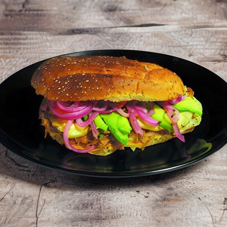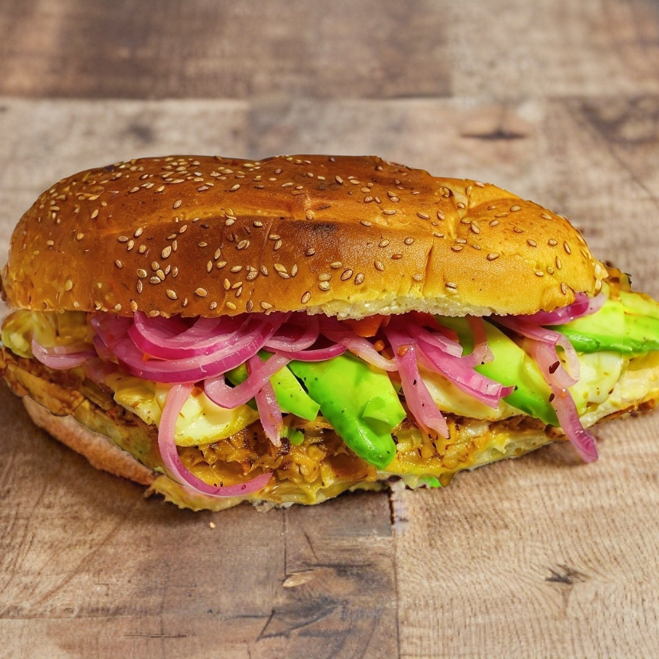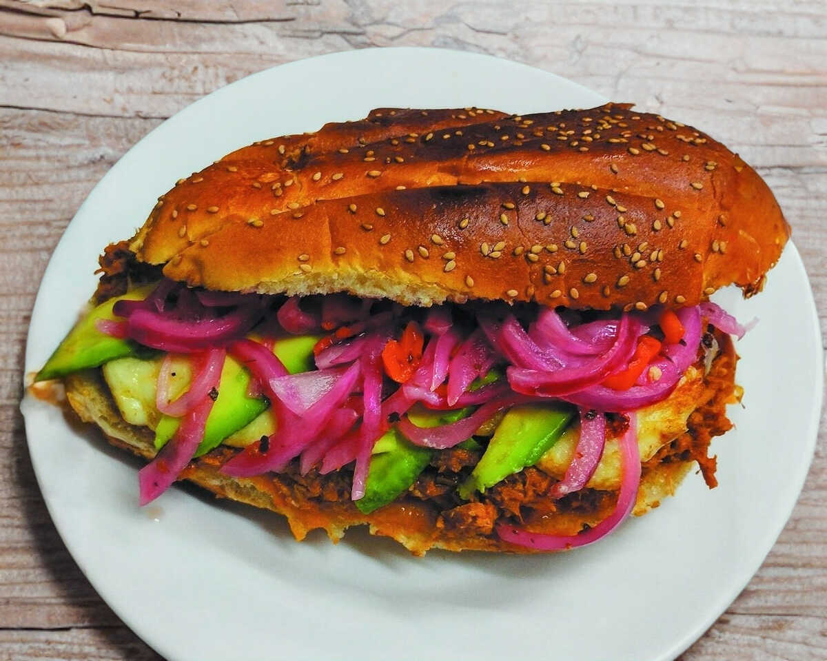 Deliciosa torta de cochinita pibil con queso fundido, jitomate, aguacate y cebolla morada con habanero.