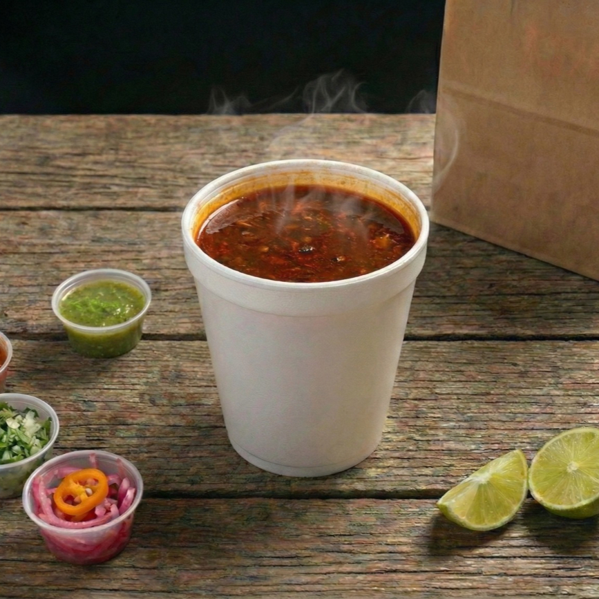 Puro jugo de birria concentrado. Caliente, especiado y listo para beber o chopear tus tacos. (Elige tamaño: Chico o Litro).