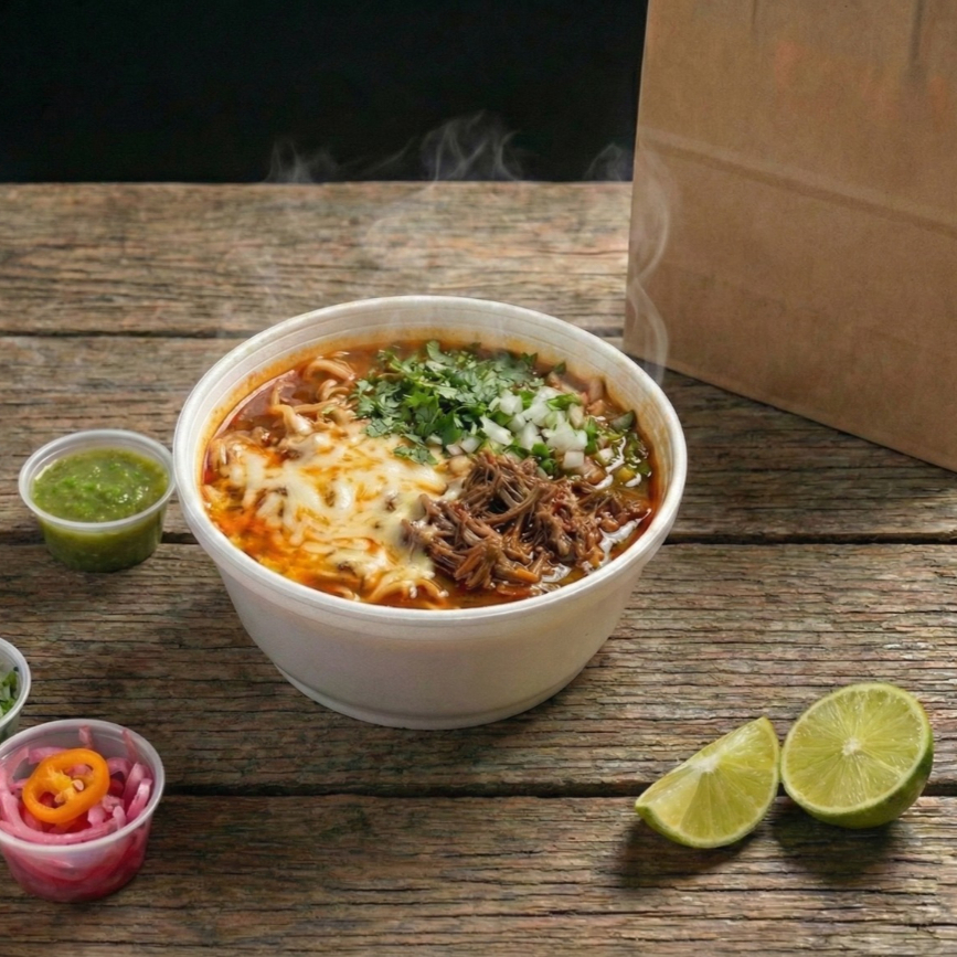 Lo último en tecnología anti-cruda. Fideos Ramen cocidos en puro consomé concentrado, con carne de birria de res y un toque picante. Te regresa a la vida en 15 min.