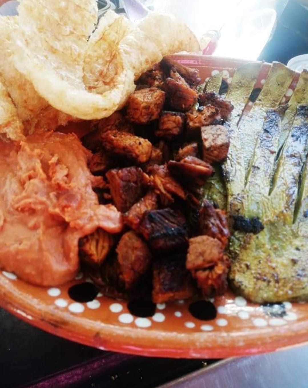 Acompañada de nopales, chicharrón y frijoles.