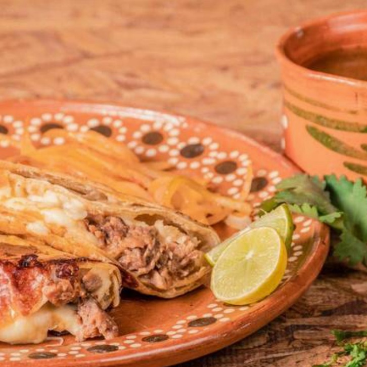 Tortilla doradita a la plancha con birria y queso derretido, acompañada de cebollita asada, disponibilidad de envoltura de tortilla de maíz o tortilla de harina.