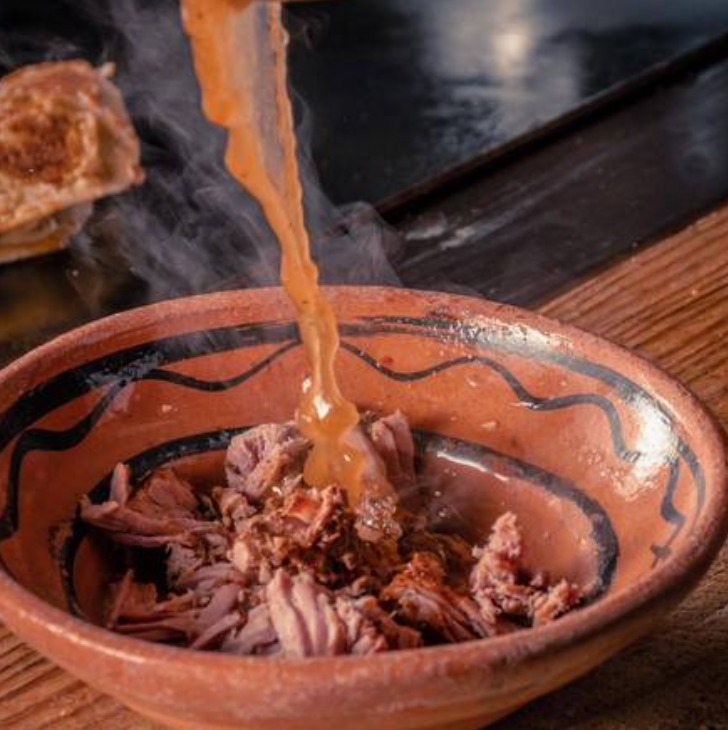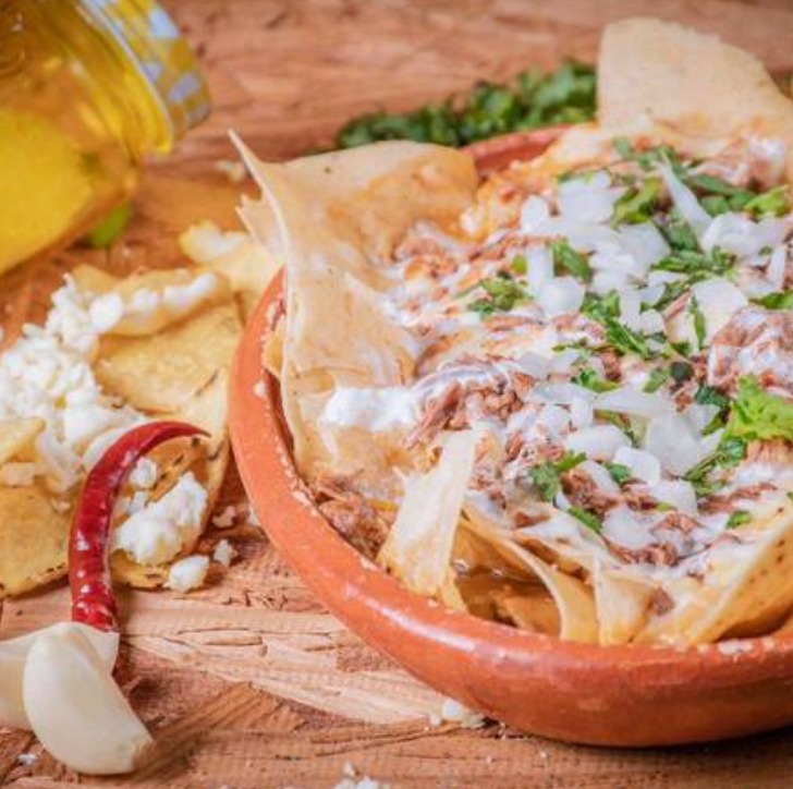 Cama de crujiente tortilla de maíz con una costra de queso y carne bañada en consomé, costra de queso mozzarella, carne de res.