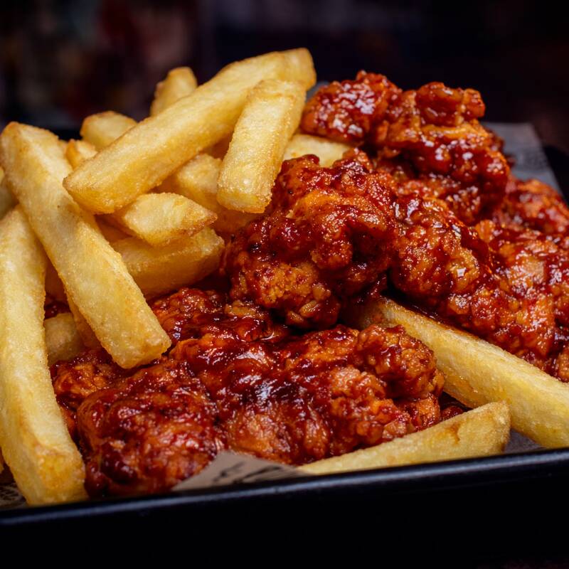 Boneless bañados en salsa acompañados de papas crujientes. Combo brutal para compartir ó calmar el antojo