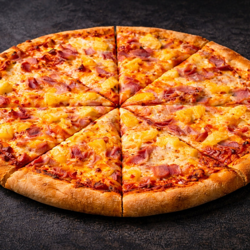 Pizza mediana 35cm. Jamón y piña dulce sobre 4 quesos. el pecado que divide mesas y rompe amistades. no expliques. mastica.