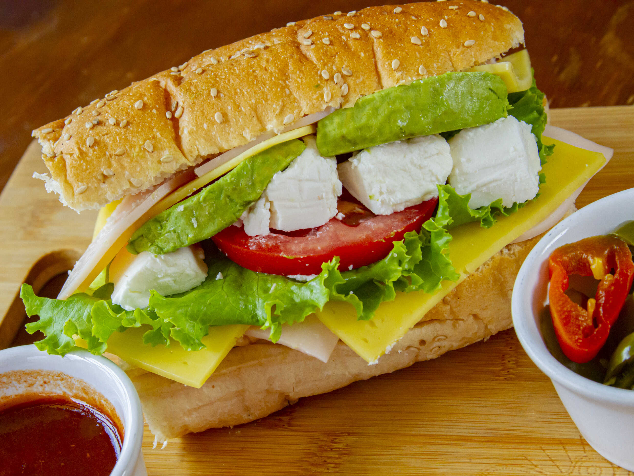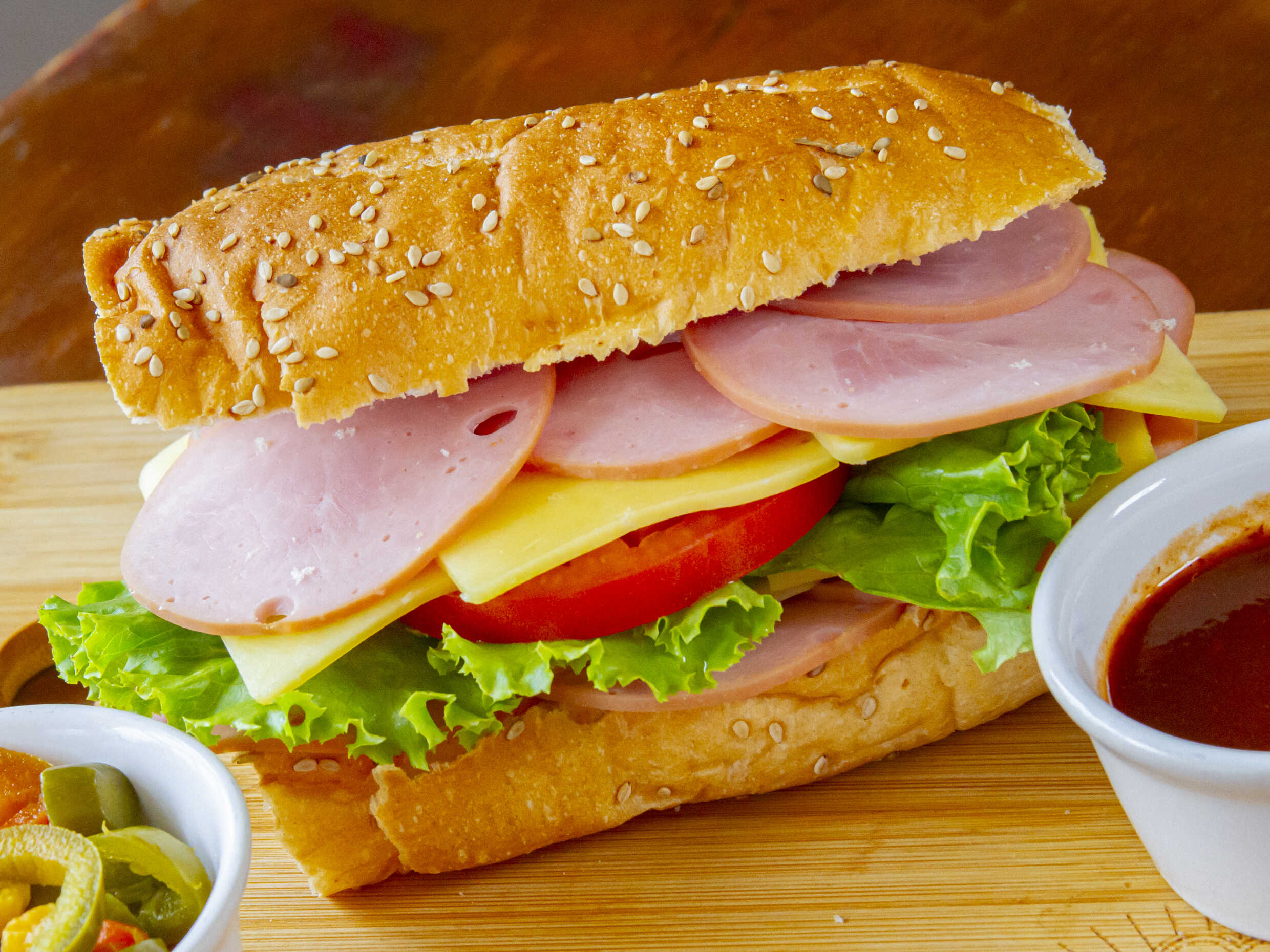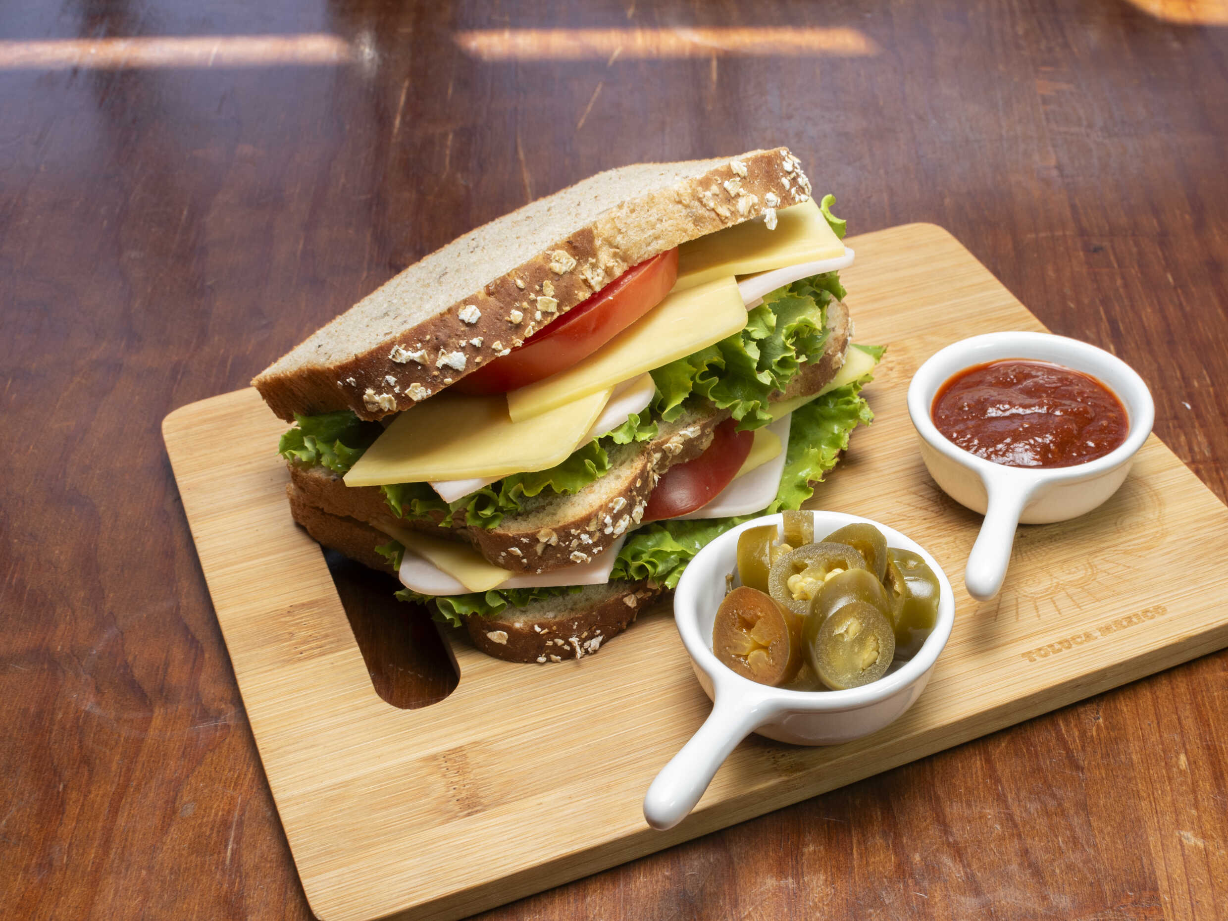 Jamon y queso oaxaca, incluy racion de fruta y jugo o cafe