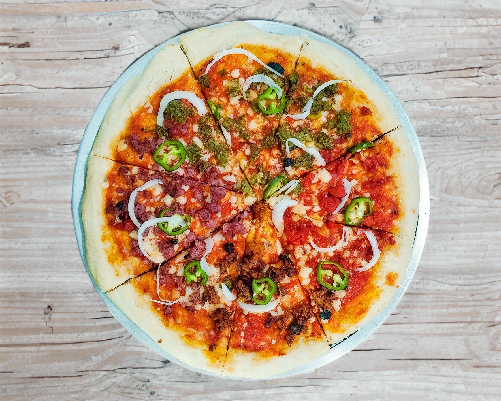 Queso mozarella, salsa pomodoro, masa clásica y combinación de cuatro chorizos: Rojo, Verde, Mango-Habanero y Argentino