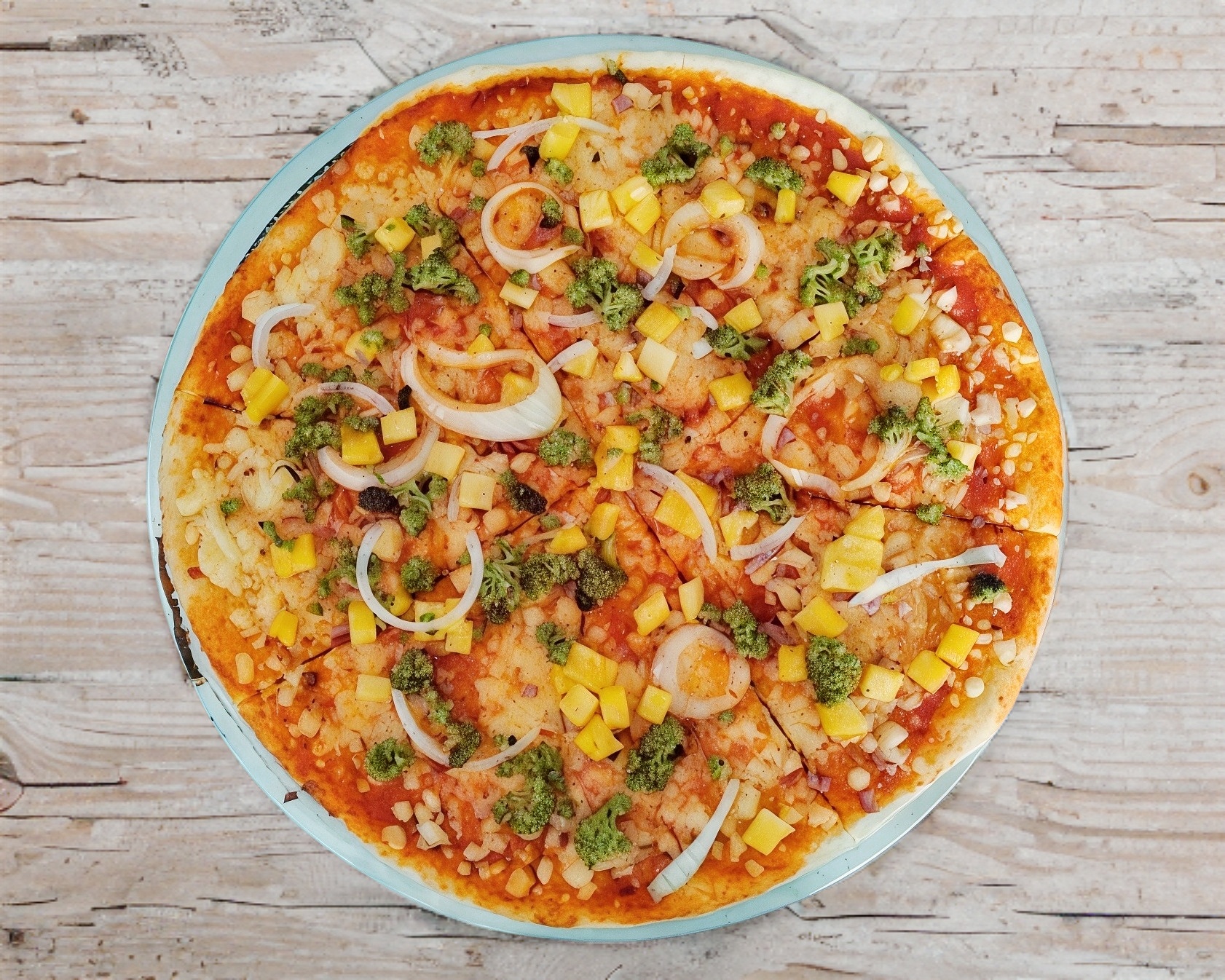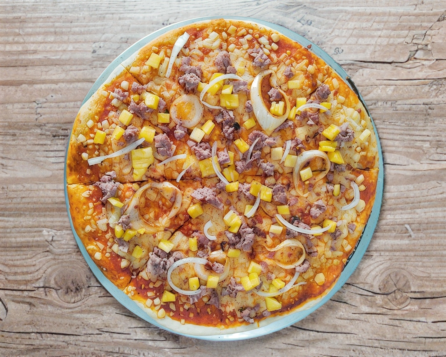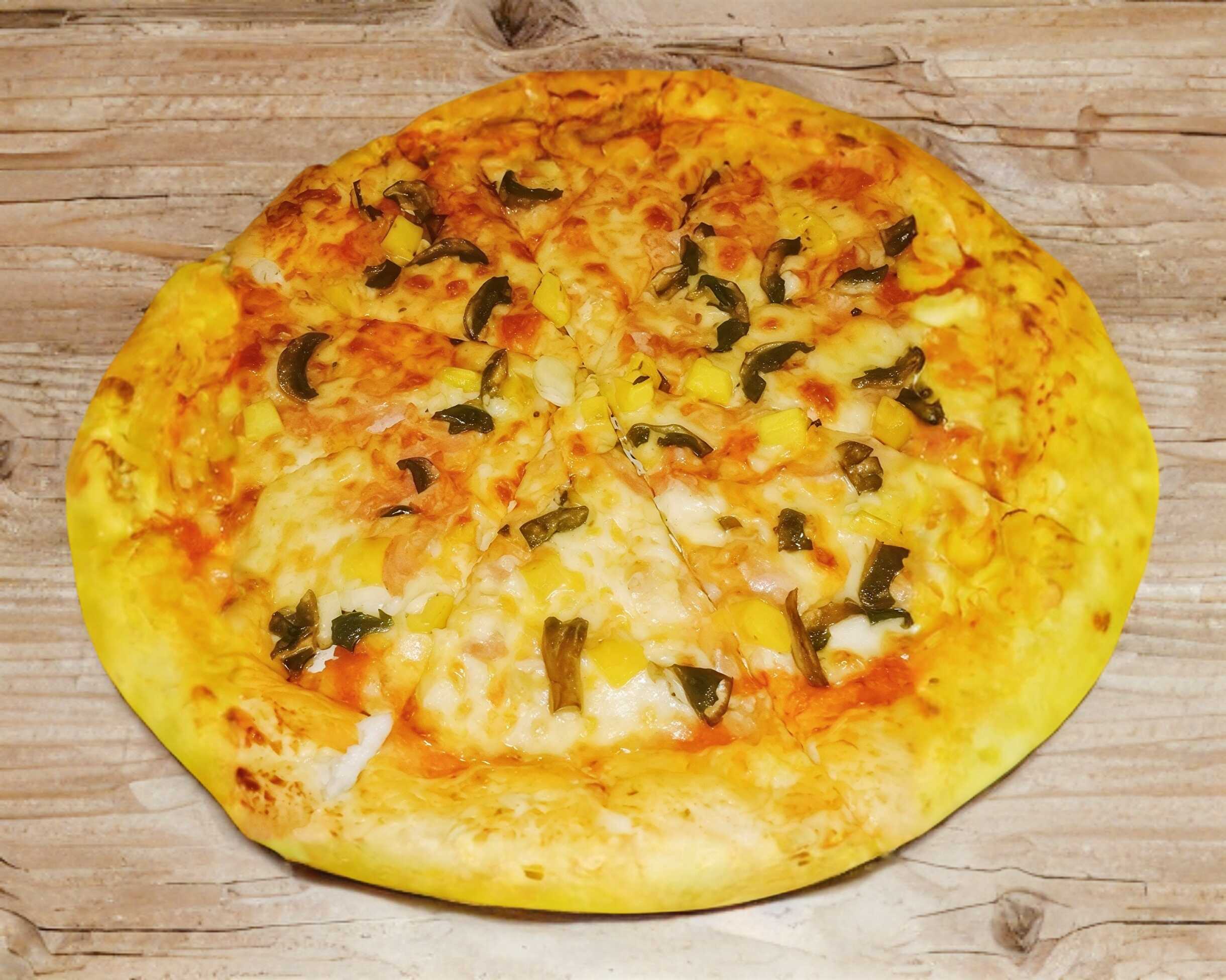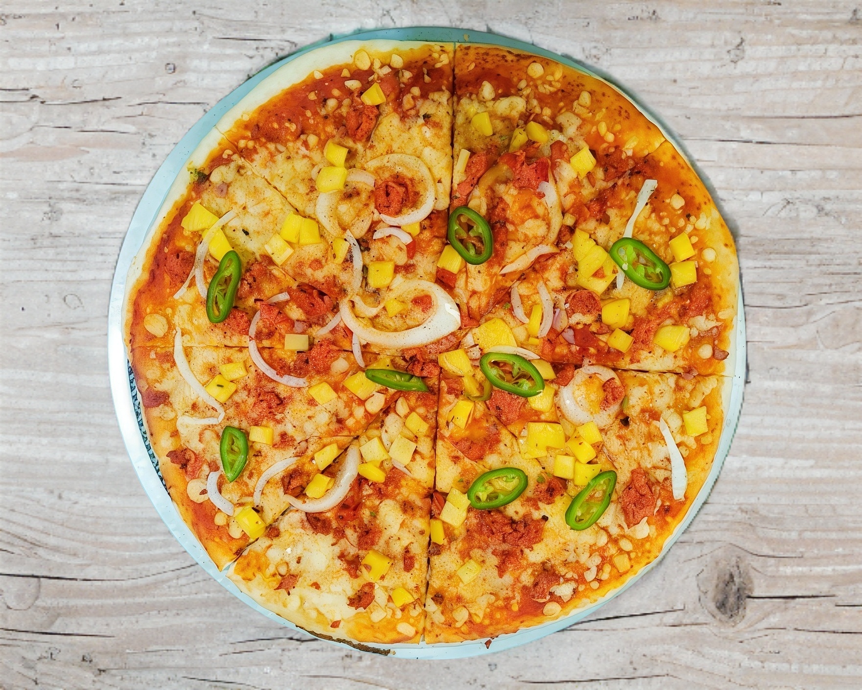 Queso mozzarella, piña, cebolla, chorizo con un toque de mango y habanero, salsa de la casa y masa clásica