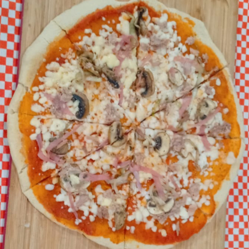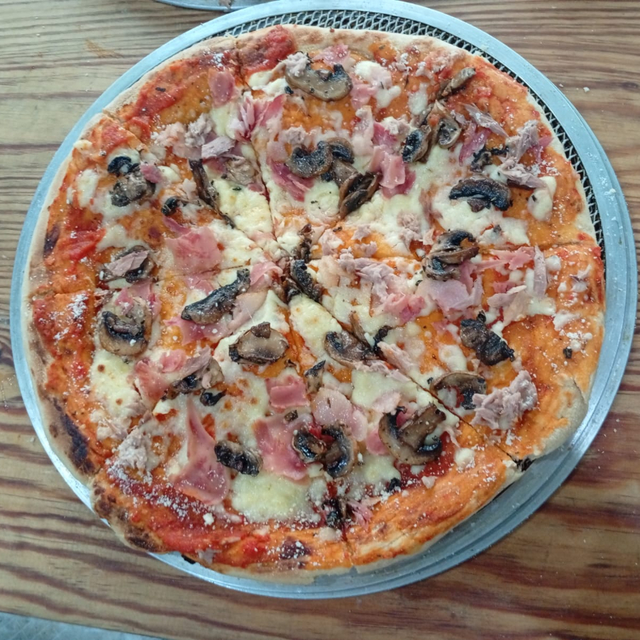 Queso mozzarella, salsa pomodoro, atún, champiñones, cebolla y jamón.