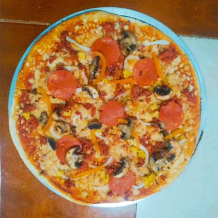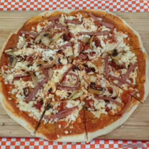 Queso mozzarella, salsa pomodoro, chorizo, champiñones, jamón, cebolla y salami.