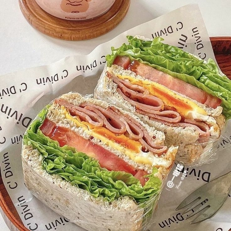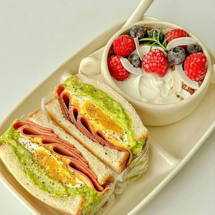 Un sándwich con jamón de pavo con queso manchego, aguacate, jitomate y lechuga. Acompañado con un bowl de frutos rojos con yogurt.