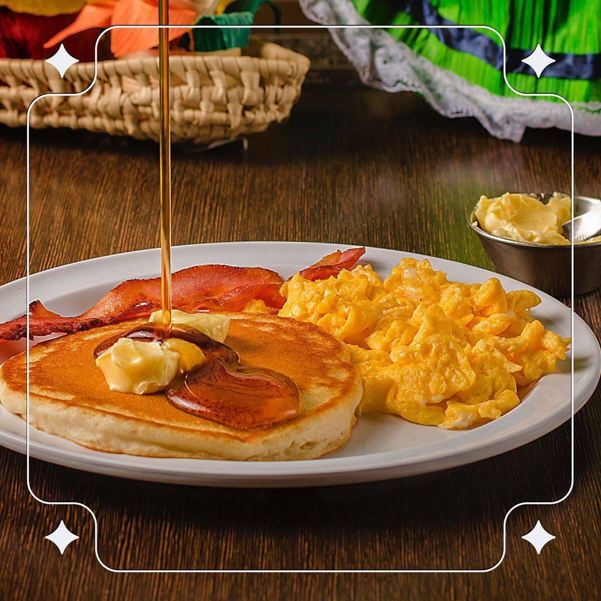 Jugo de naranja. Hot cakes clásicos: 3 pz de hot cakes con trocitos de fruta de temporada con chocolate y azúcar glass.