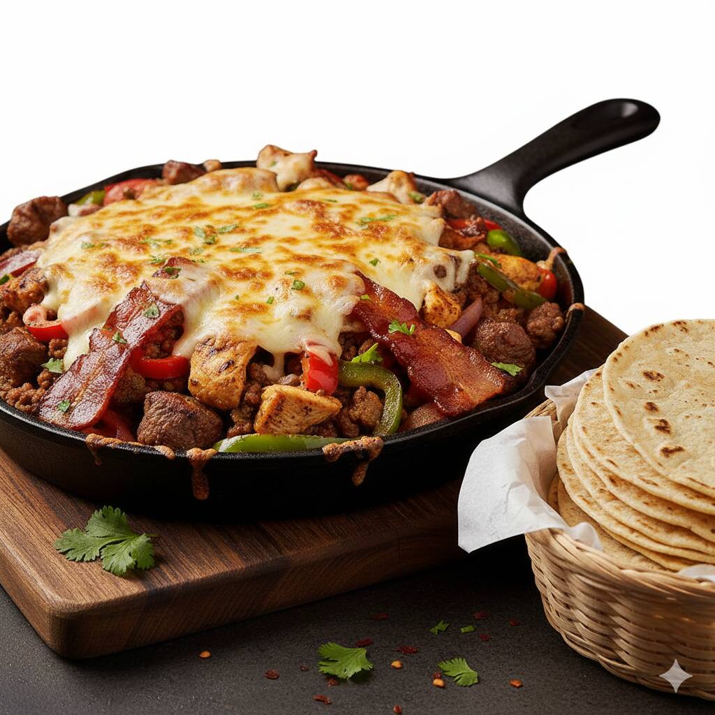 Tu proteína favorita con un toque irresistible: tocino crujiente, cebolla y morrones asados a la plancha, todo cubierto con queso gratinado y acompañado de tortillas de maíz para taquear como se debe.