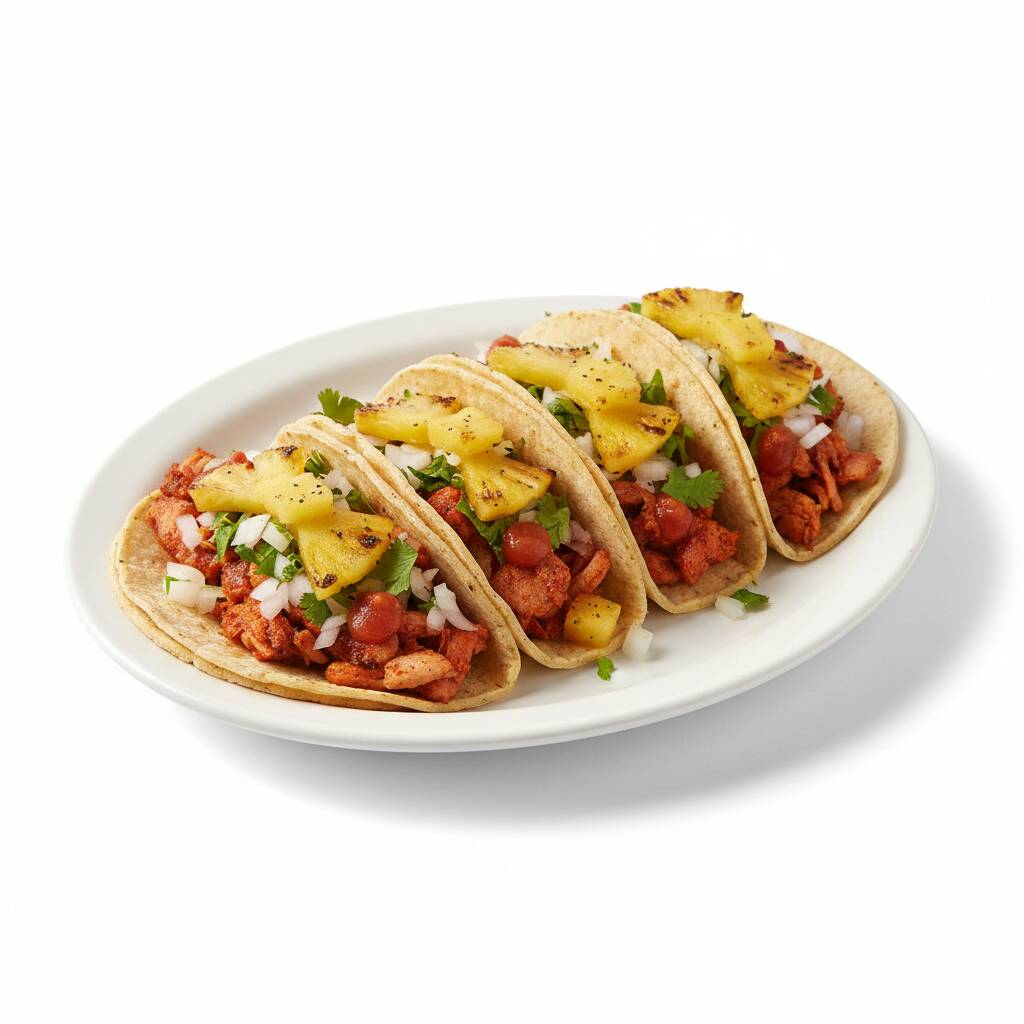 Exquisita combinación de auténtico pastor, jugosa piña y crujiente tocino, sin cebolla (250 g). Servido con una capa de queso gratinado y tortillas de maíz para disfrutar al máximo. 🌮🔥🧀