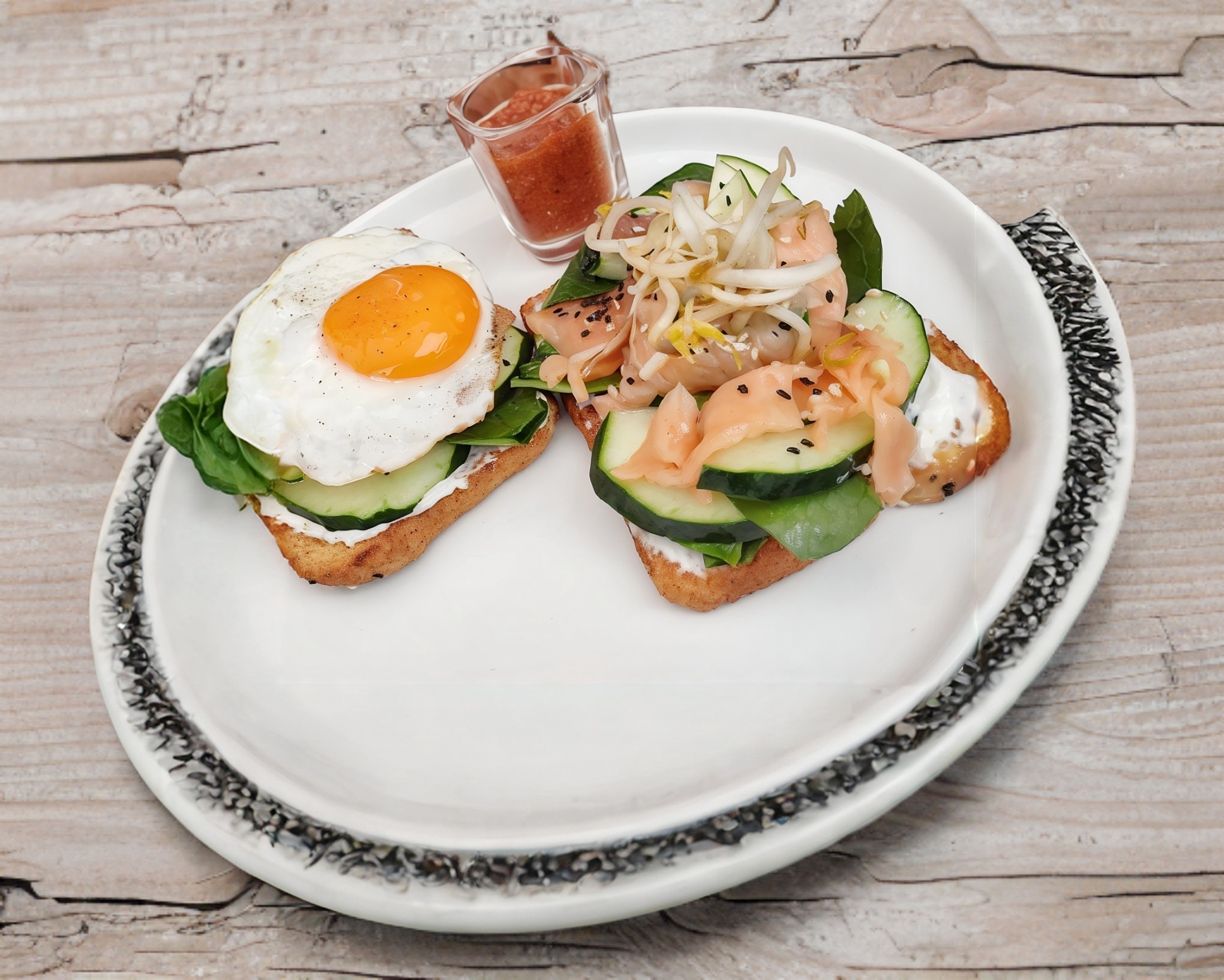 Crujiente pan de caja, salmón curado, huevo, espinacas, mezcla de quesos y pepino (2pzas).