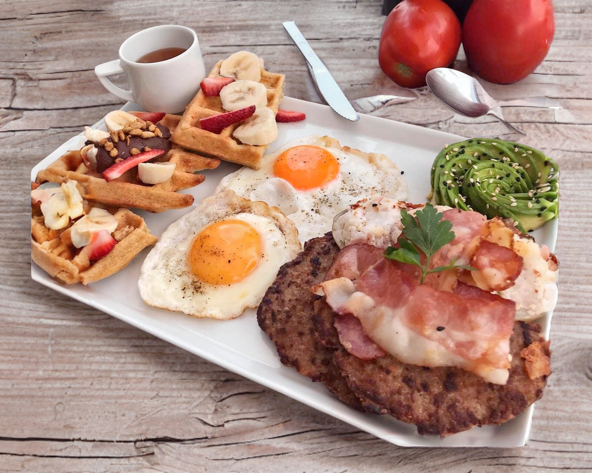 Media orden de waffles, acompañada de 2 huevos, tocino, salchichón y una papa hash.