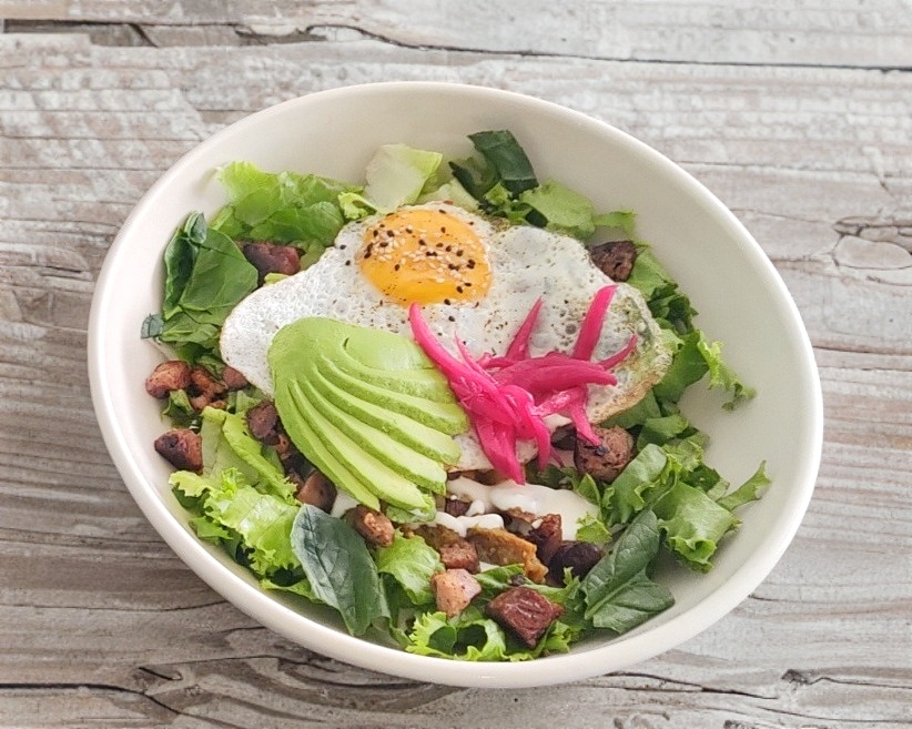 Combinación de lechugas y espinaca, acompañada de zanahoria, manzana, pepino, arándanos, semilla de girasol garapiñada, queso panela, croutones, salmón ahumado (90gr) y aderezo mostaza dulce
