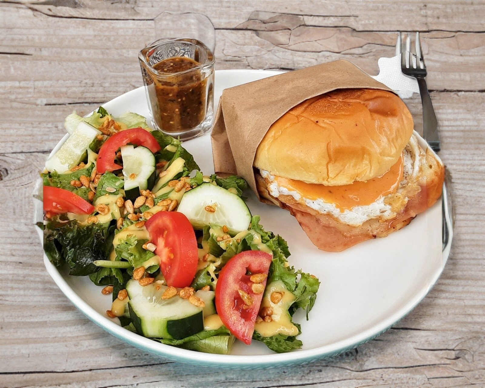 Sándwich de pan brioch, jamón 60 gramos , queso 60 gramos , 1 huevo (estrellado o revuelto) y una papa hash (smash), con nuestro aderezo especial picante, incluye ensalada del día.