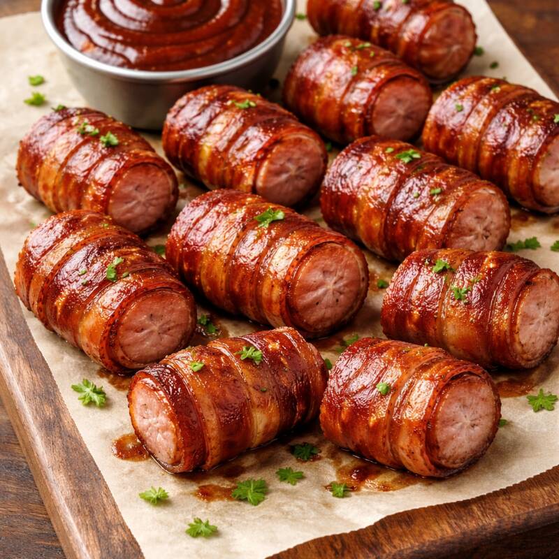 Orden de salchichas envueltas en tocino crujiente, acompañadas de una salsa a elegir.