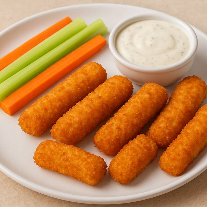 Orden de 6 deditos crujientes rellenos de queso mozzarella, acompañados de aderezo ranch. Incluye apio, y zanahoria.