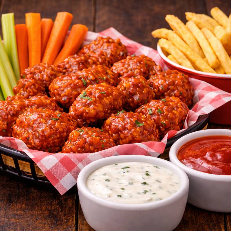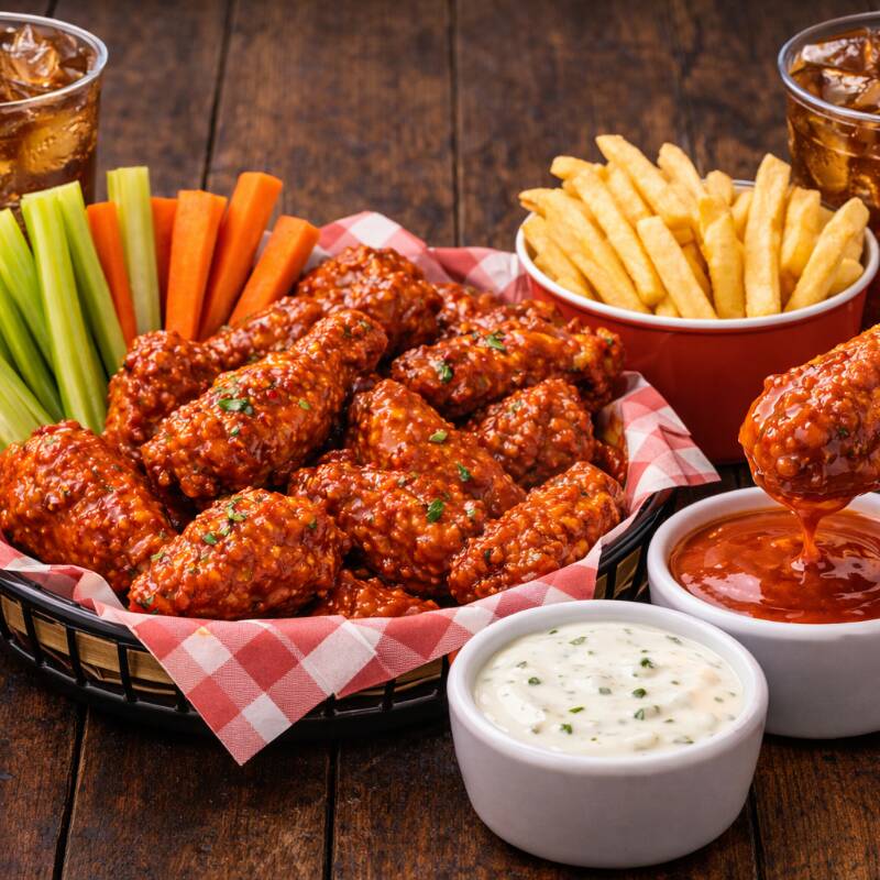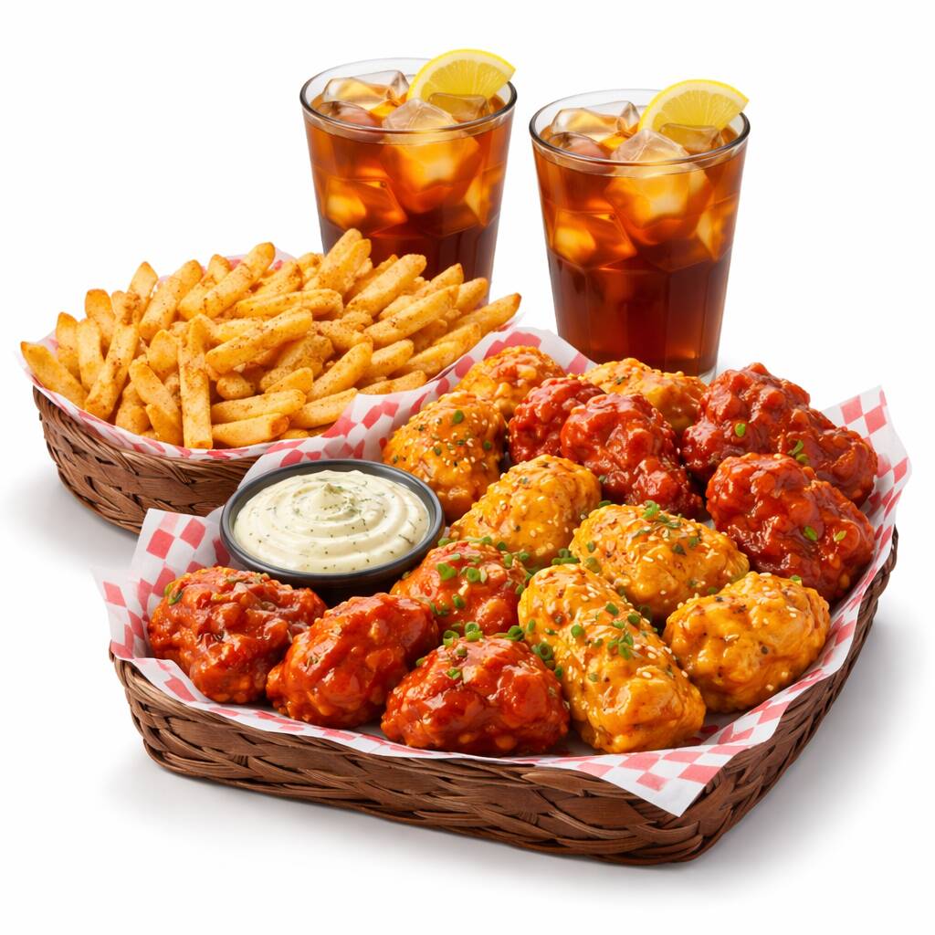 500g de boneless bañados en salsa a elegir, acompañados de una orden de papas fritas, y aderezo ranch. Incluye Apio y Zanahoria