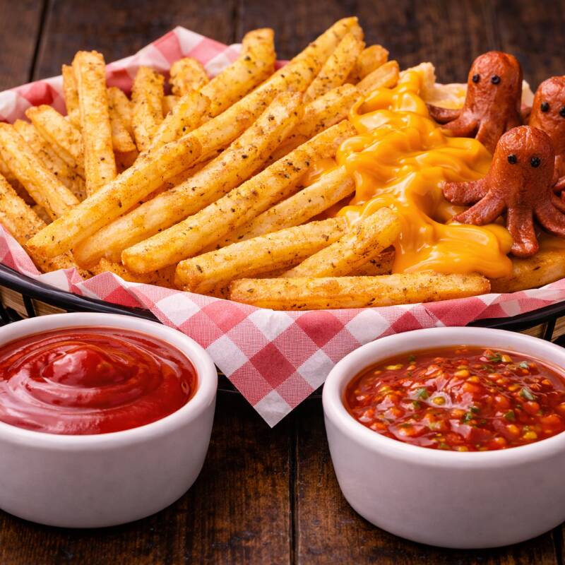 Orden de papas fritas crujientes, sazonadas, acompañadas de salchipulpos, y queso cheddar. Incluye salsa, y catsup.