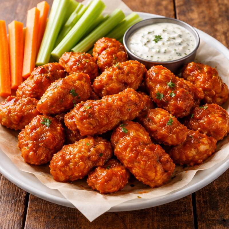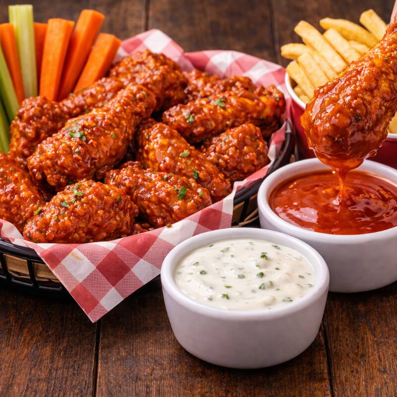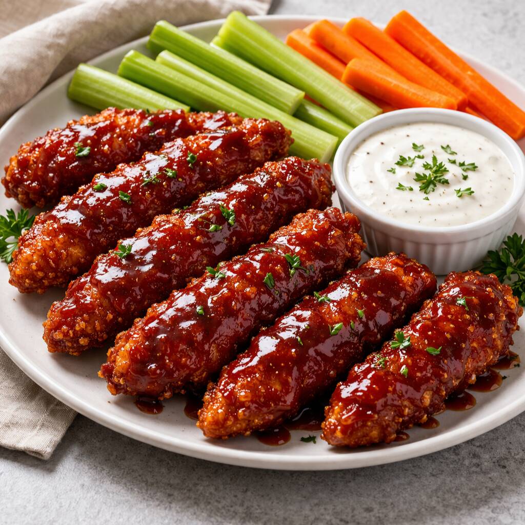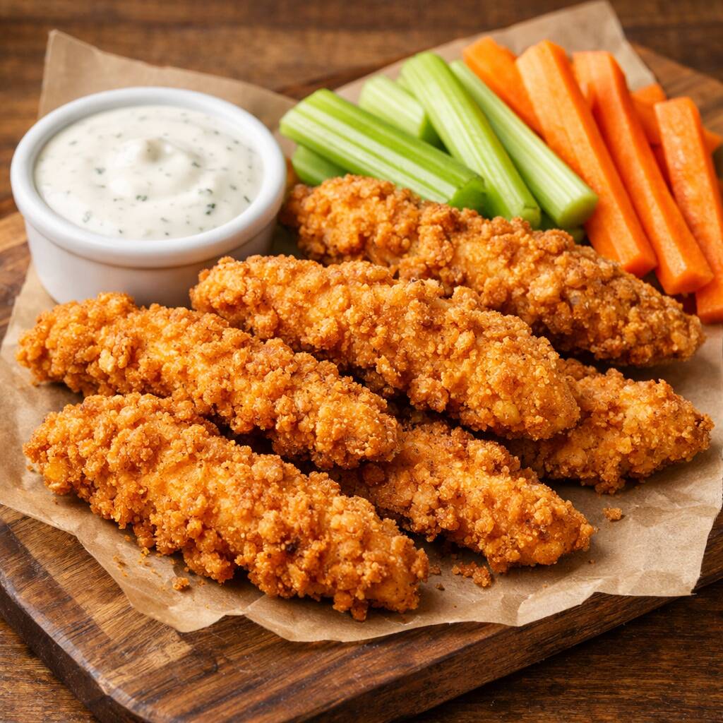 6 tenders CRUJIENTES de pechuga de pollo bañados en salsa a elegir acompañados de aderezo ranch. Incluye apio y zanahoria.