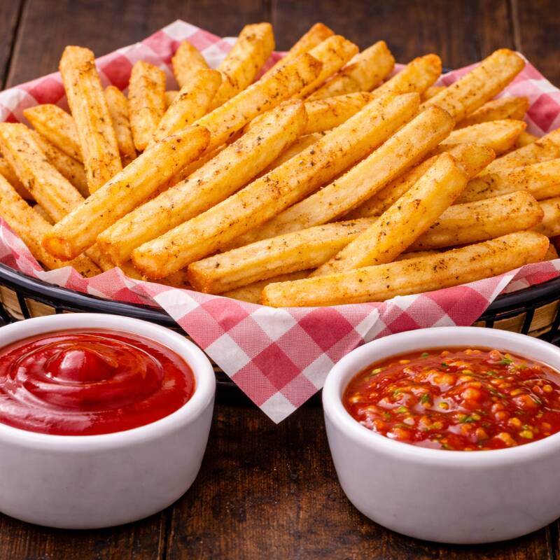 Orden de papas fritas crujientes, sazonadas, acompañadas de salsa, y catsup.