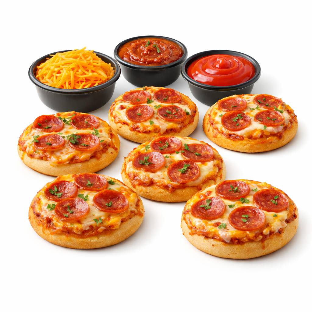 Orden de 6 minipizas de peperoni con queso mozarella, acompañados de salsa y catsup. Y una porción de queso cheddar.