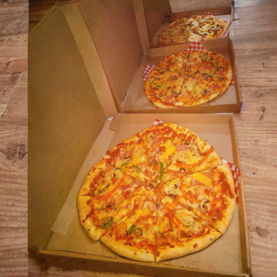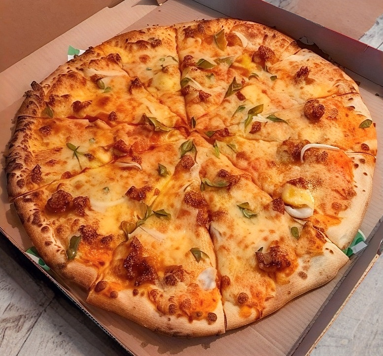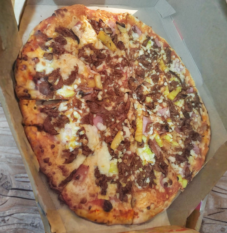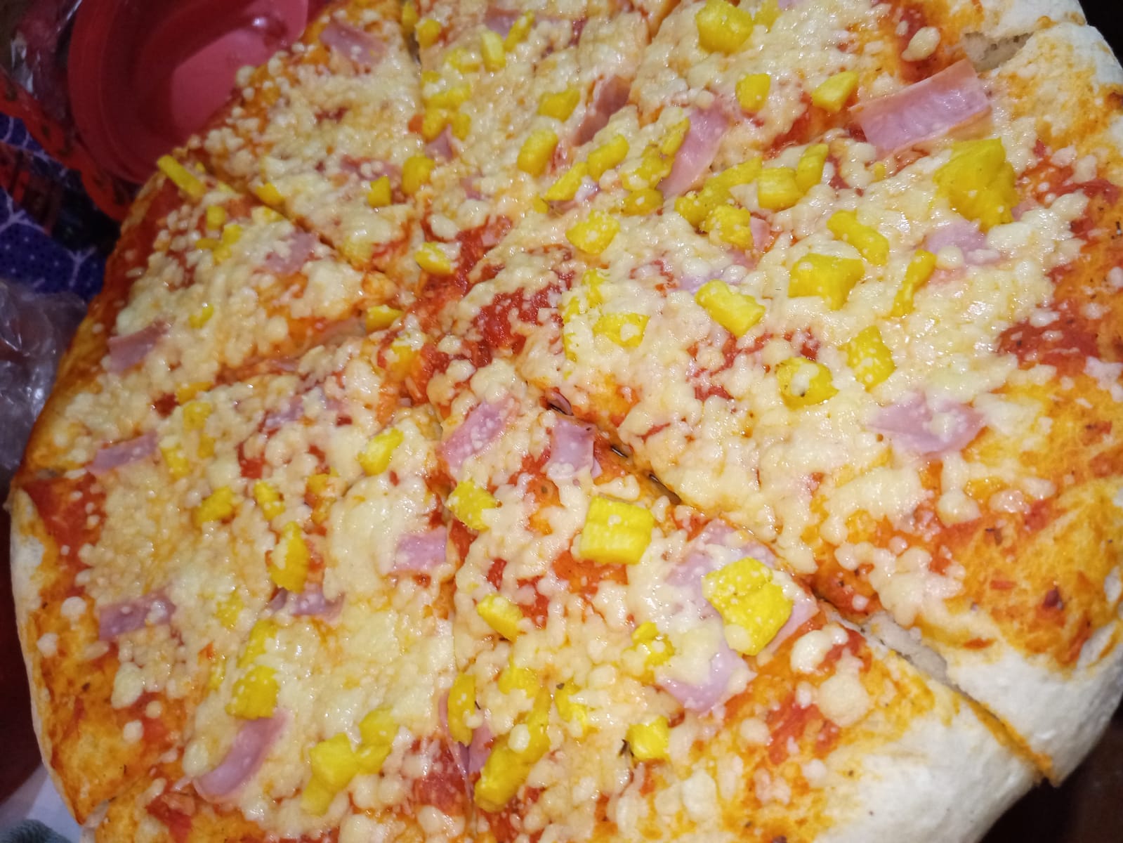 12 rebanadas de Pizza Hawaiana (jamón, piña y queso).