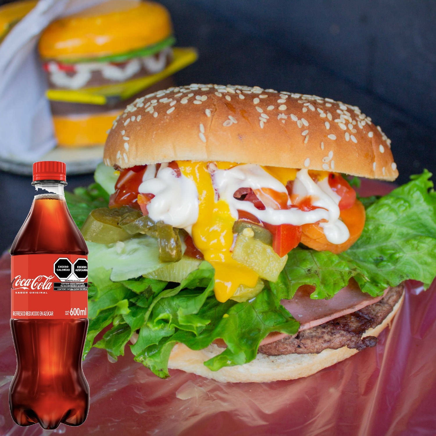Hamburguesa al carbón, con carne jugosa de res y pan suave. Acompañado con lechuga, jitomate, chile, mayonesa, mostaza, catsup