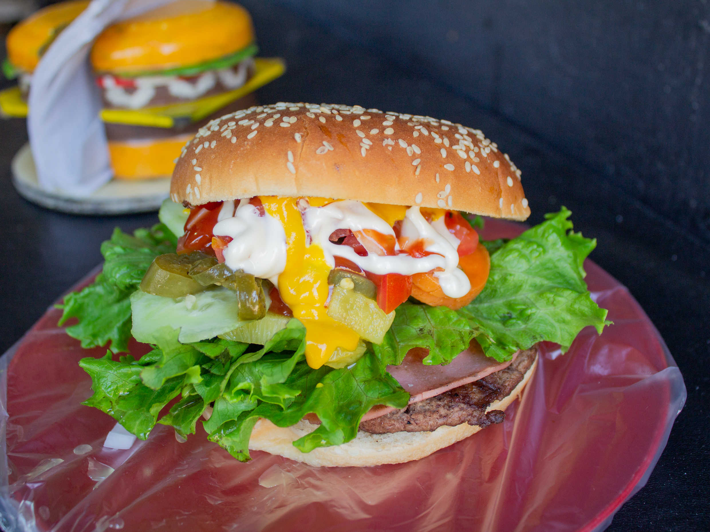 Hamburguesa al carbón, con carne jugosa y pan suave. Acompañado con lechuga, jitomate, chile, mayonesa, mostaza, cátsup