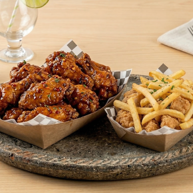 El festín definitivo para los amantes del pollo. Incluye 600 gramos de nuestras alitas jugosas y crujientes, acompañadas de 250 gramos de boneless de pechuga tierna y bien empanizada. Bañados en la salsa de tu elección y servidos con bastones de verdura fresca.