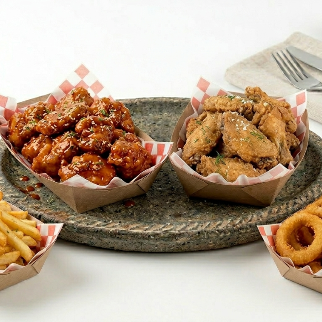 El paquete definitivo para compartir. Incluye 900 gramos de nuestras jugosas alitas doraditas, 500 gramos de boneless de pechuga tierna y crujiente, más una generosa orden de 300 gramos de papas a la francesa sazonadas. Servido con verdura fresca. ¡Nadie se quedará con hambre!